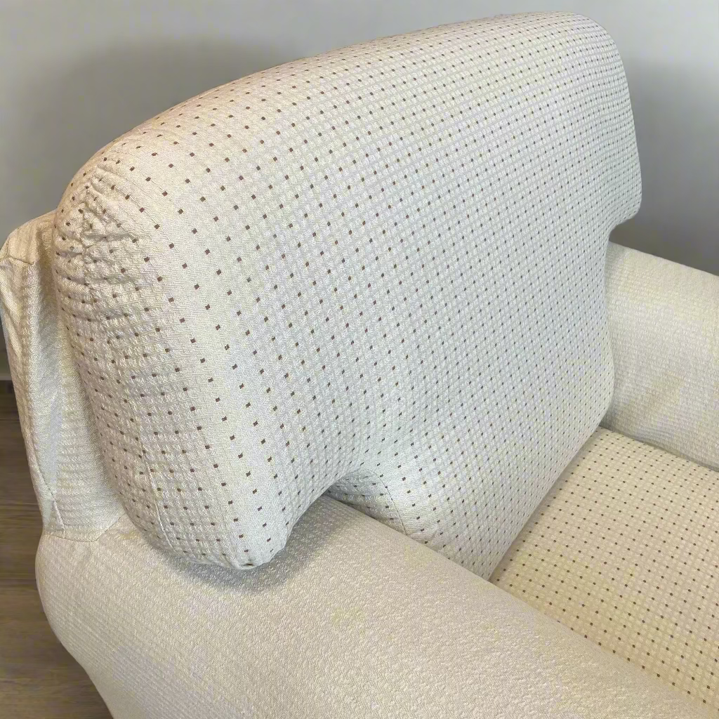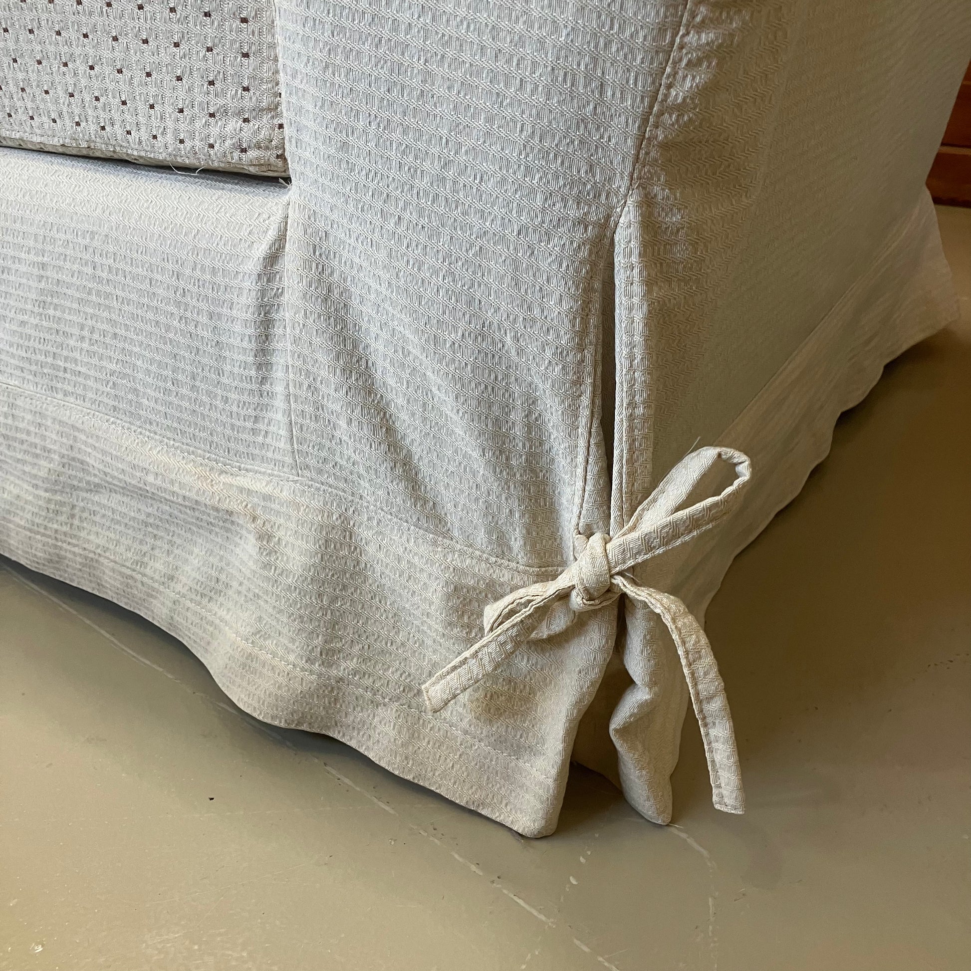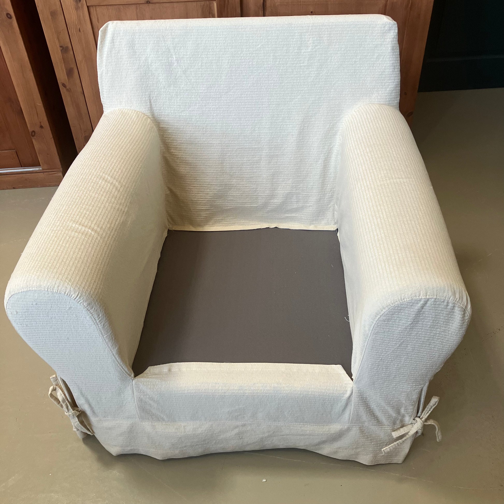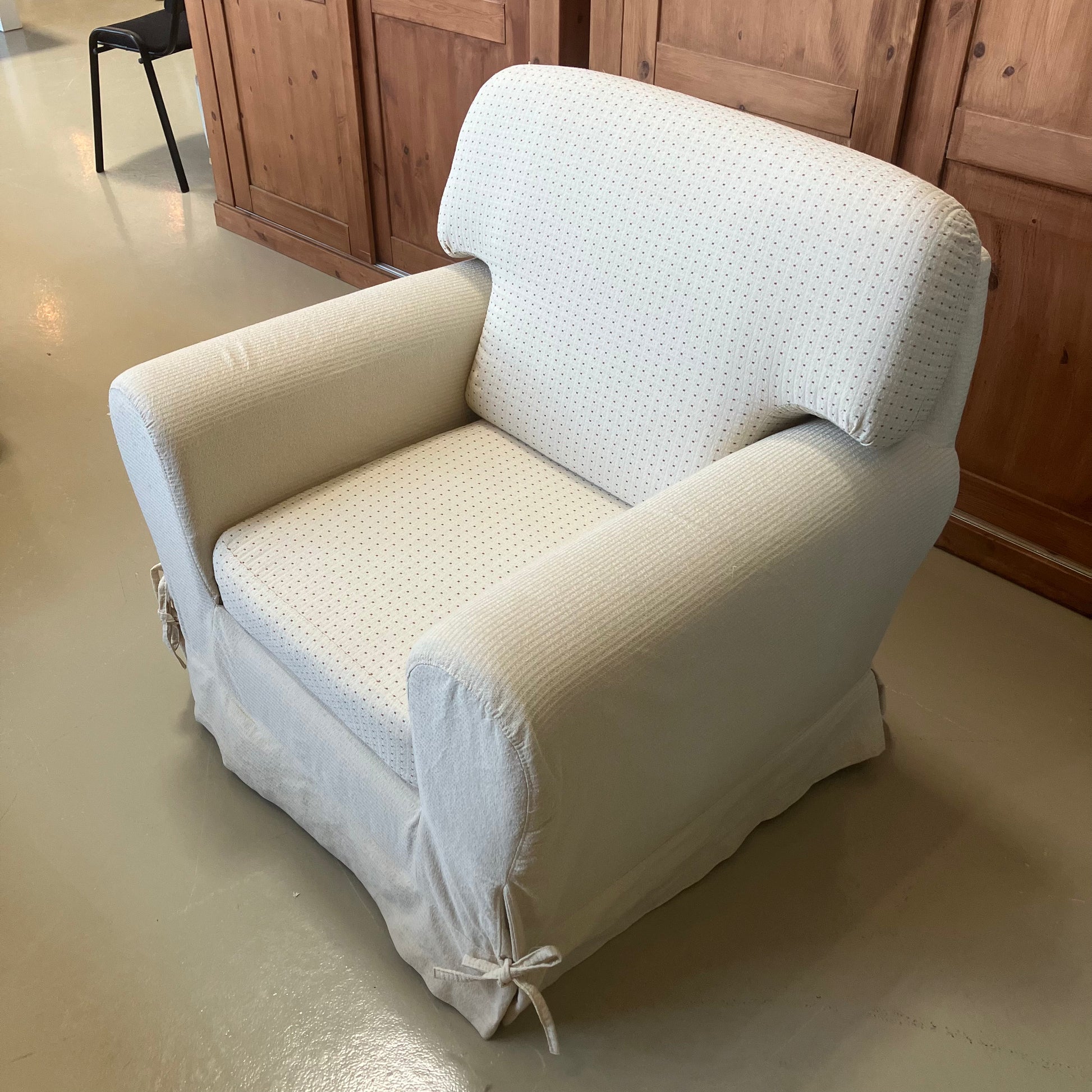 Comfortable, generously cushioned armchair in a neutral cream tone. Comes with a removable, tied cover for easy care and a relaxed cottage-style look.