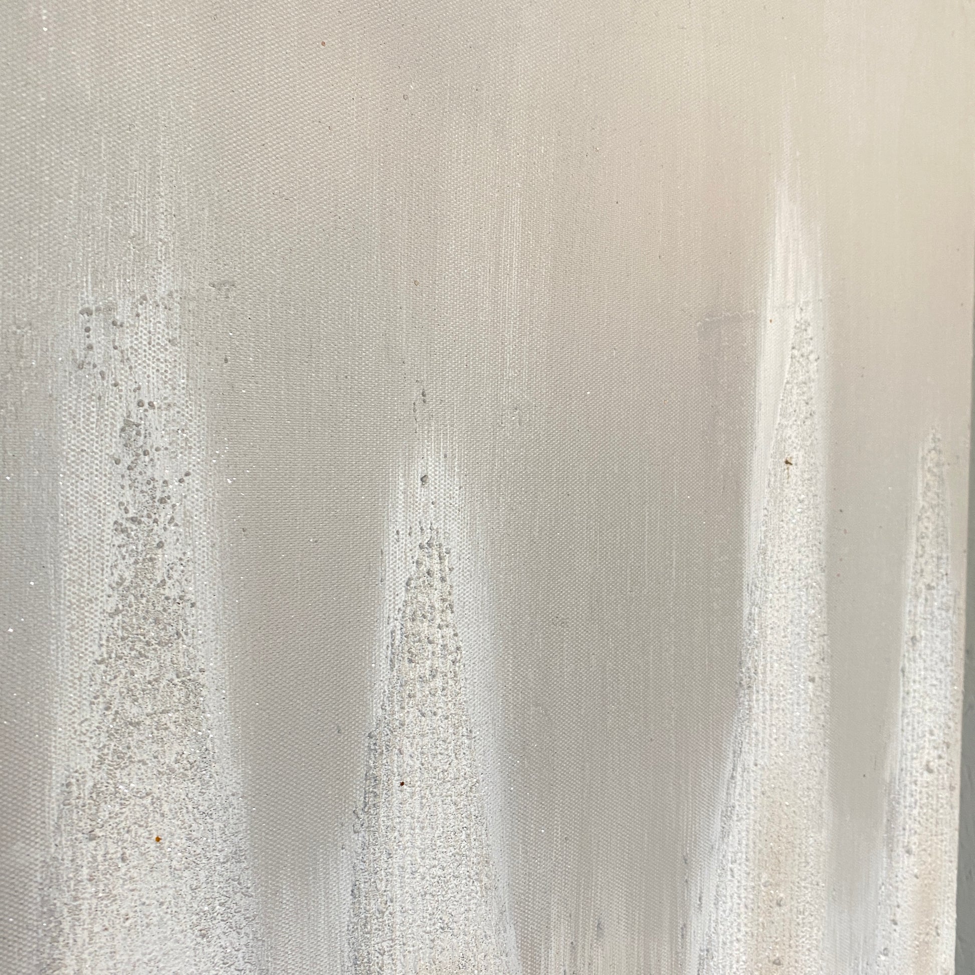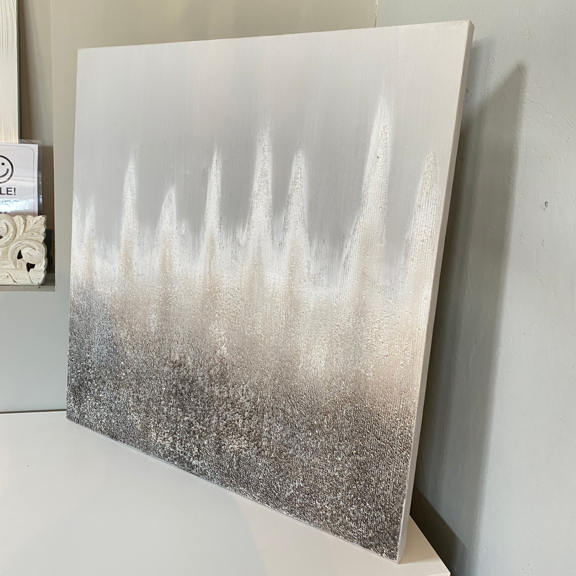 Elegant abstract wall art in tones of grey and silver with textured detailing. Adds a modern, sophisticated touch to living spaces or bedrooms.