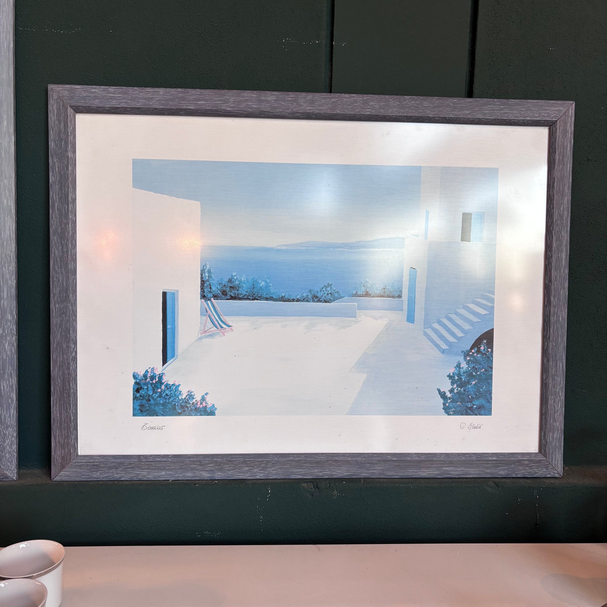 Tranquil framed piece depicting a bright blue and white courtyard, perfect for creating a serene, Mediterranean-inspired atmosphere.