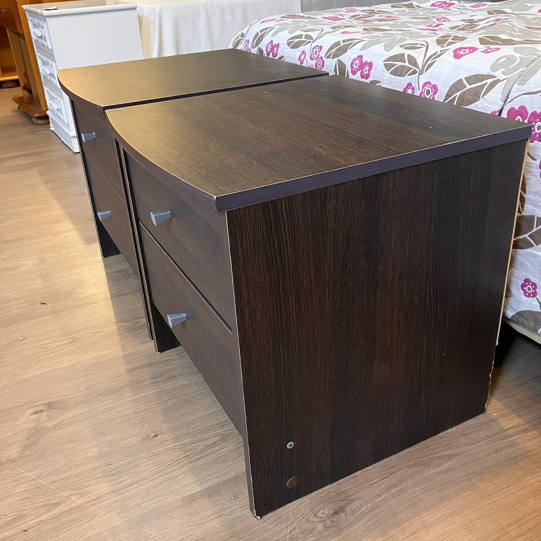 Clean and practical, this matching set includes two compact nightstands with sleek silver knobs and ample drawer space.