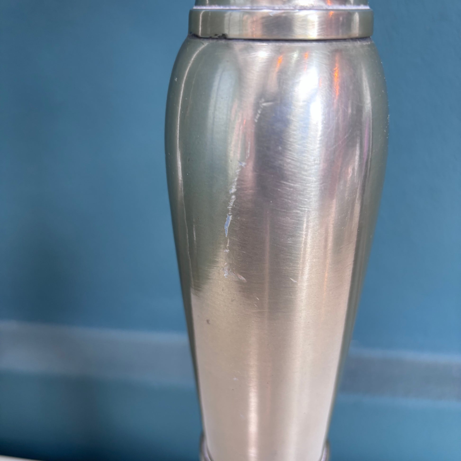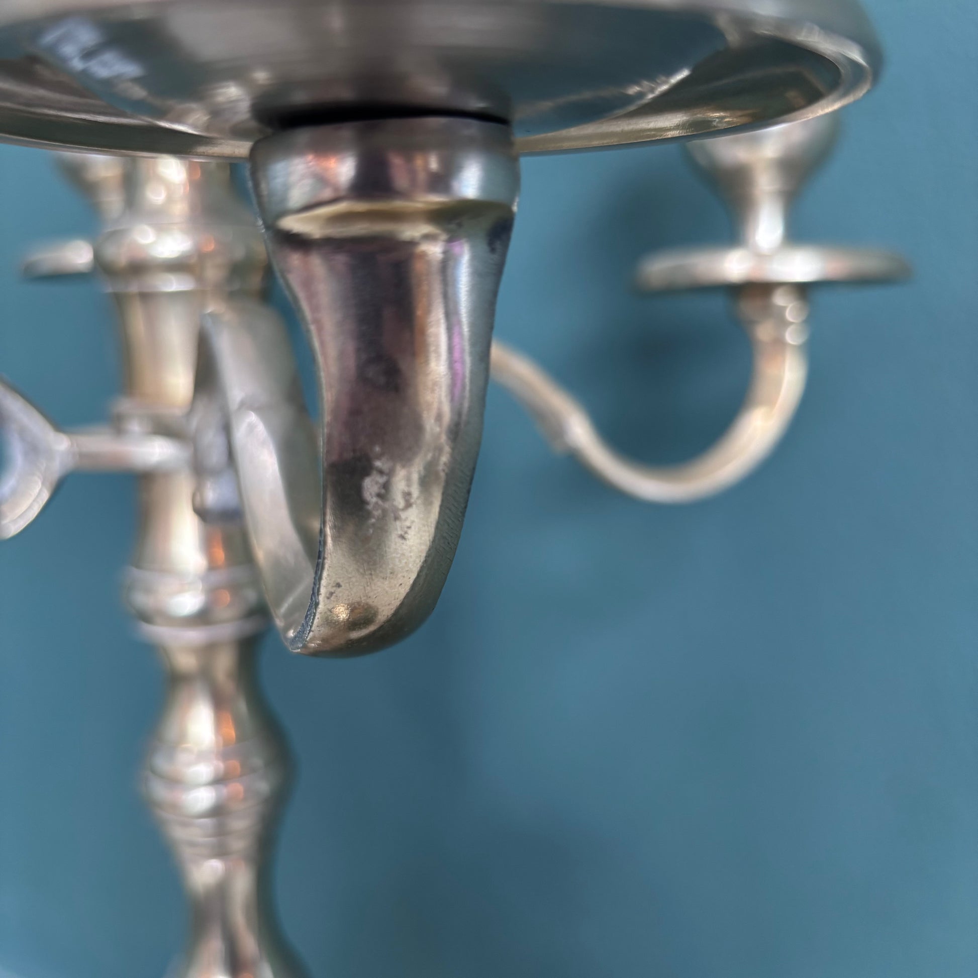 A large silver-tone candelabra with multiple candle holders. Eye-catching decorative piece.