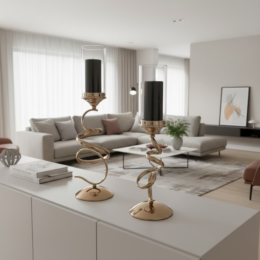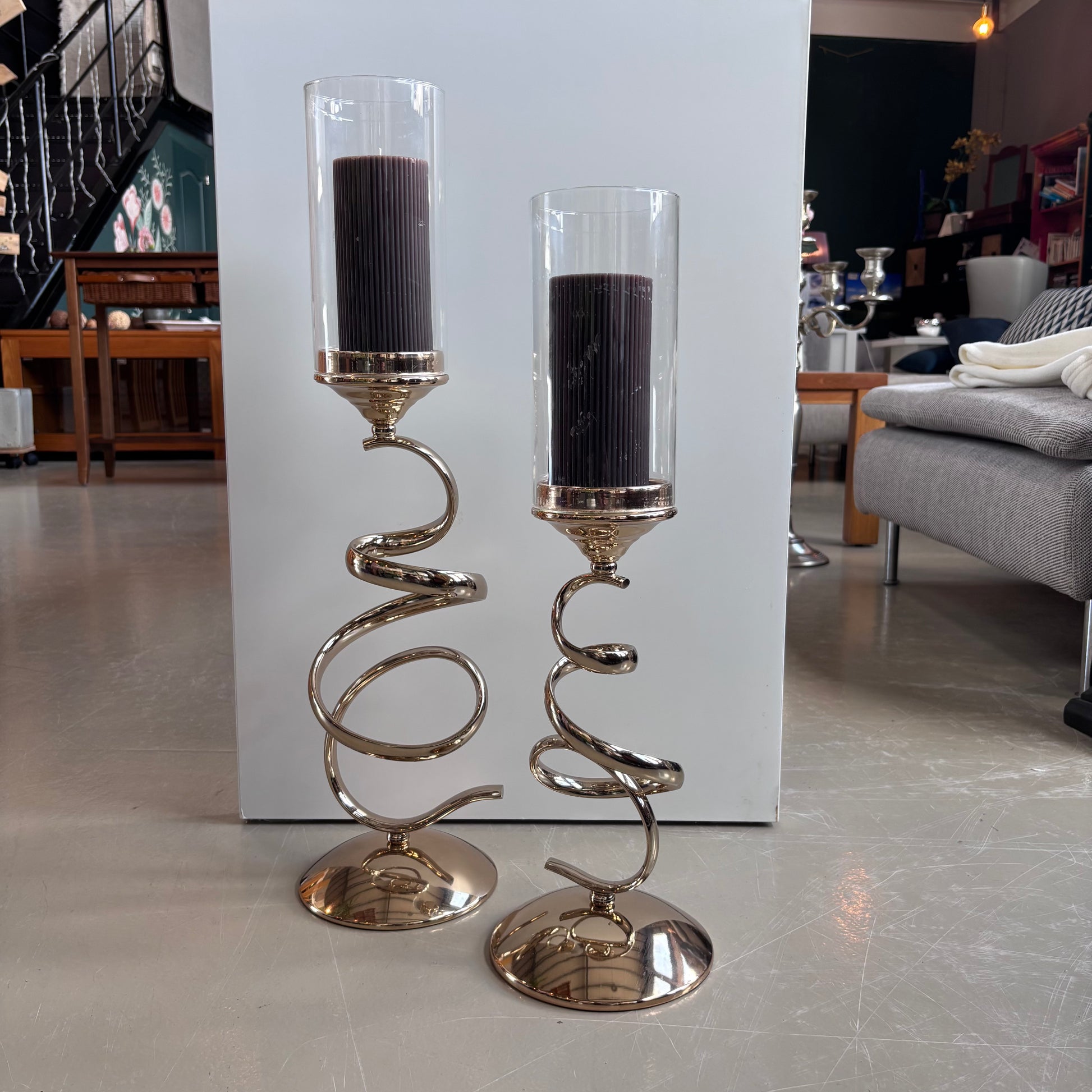 Elegant pair of gold metal candle stands with removable glass hurricane shades (brown candles included). Stylish for dining tables or mantels.