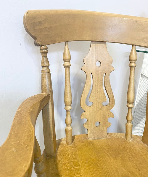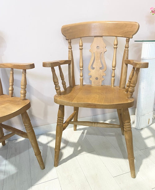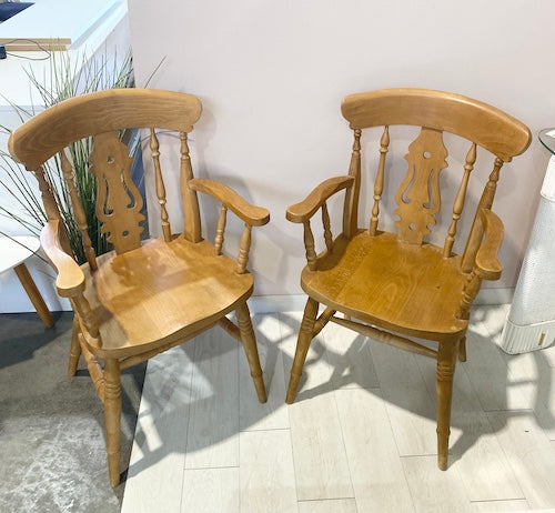 A classic pair of traditional solid wood carver chairs, featuring elegant spindle backs, carved splat details, and shaped armrests for added comfort.