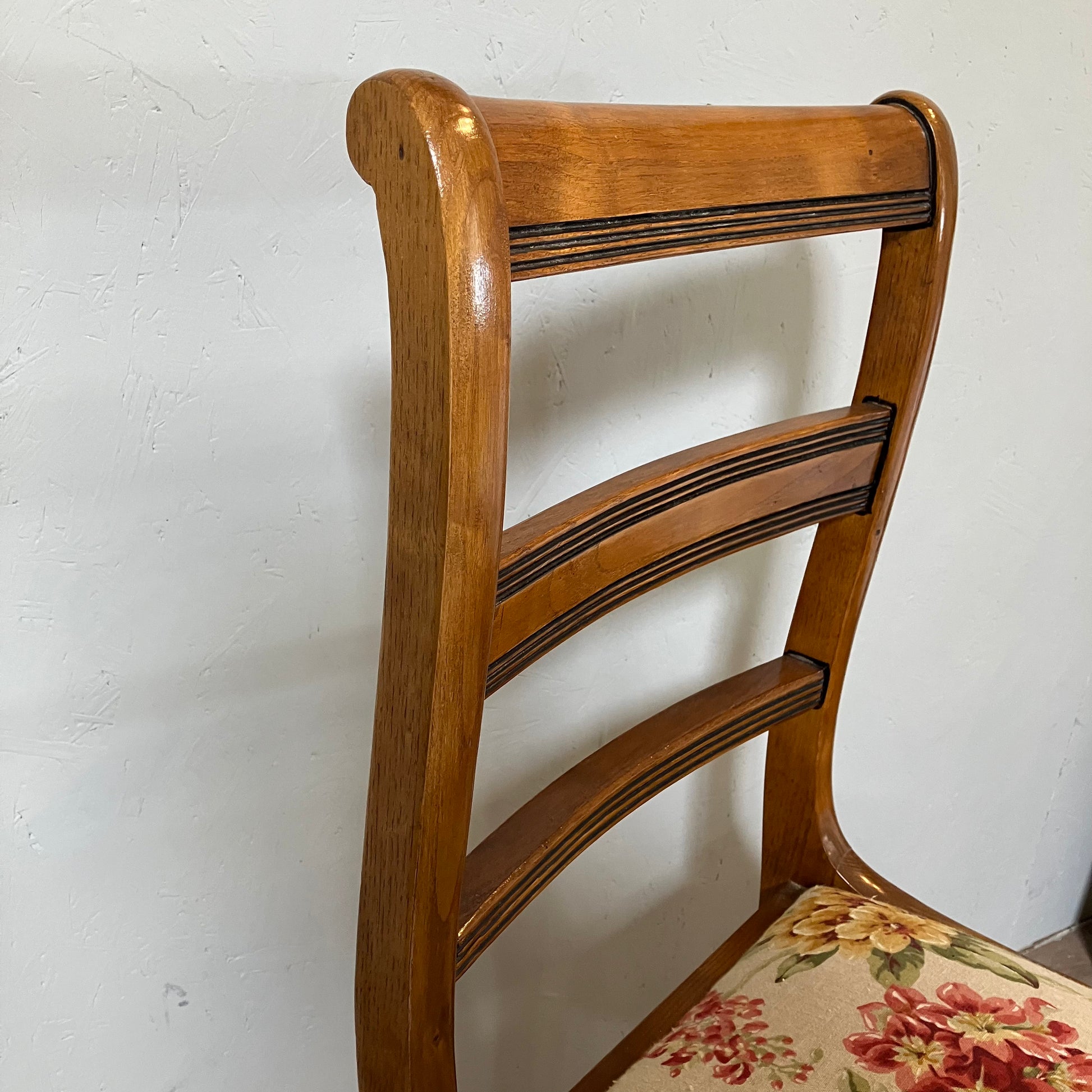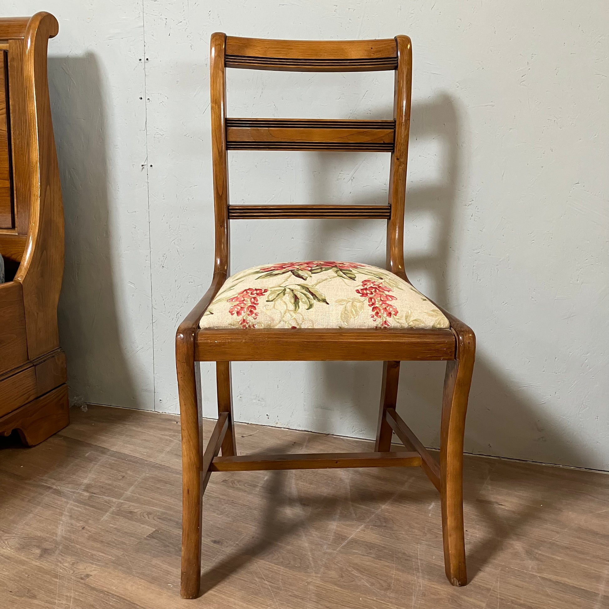 Vintage-style chair with floral upholstered seat and curved wooden backrest. Adds a decorative touch to dining areas, bedrooms or as a standalone accent piece.