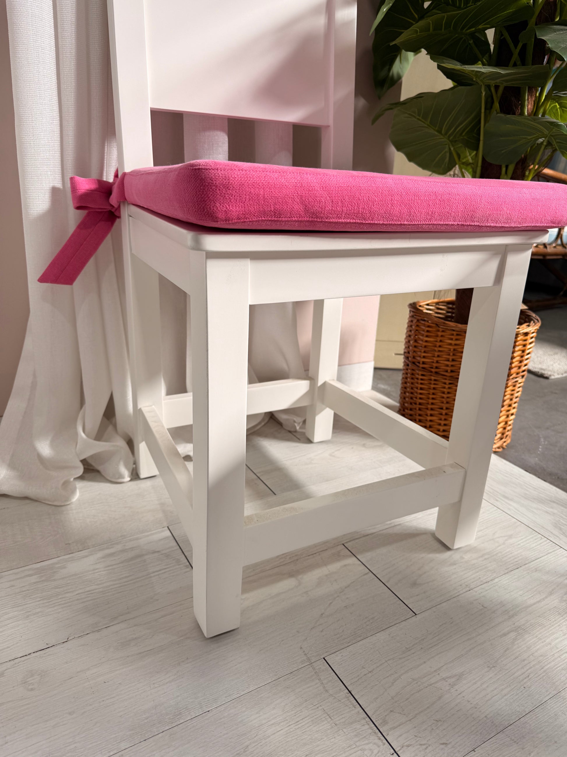 A whimsical painted chair featuring a vibrant pink cushion. Adds a cheerful, creative touch to a vanity, desk, or dining area.
