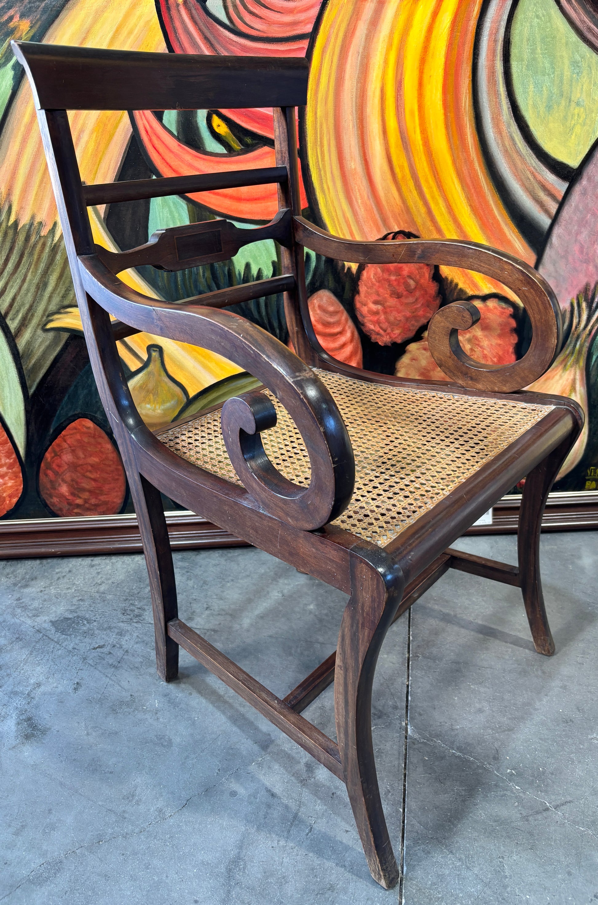 An antique dark wood single chair which has a carved ladder back, elegantly scrolled arms and a woven cane seat which is intact with no damage.