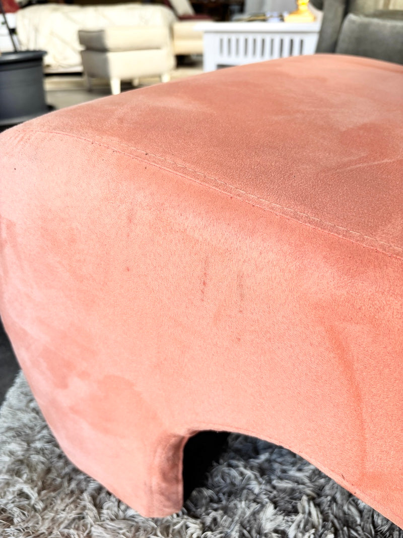 This single low chair, with its contemporary curved design, is upholstered in a plush peach-orange velvet fabric.