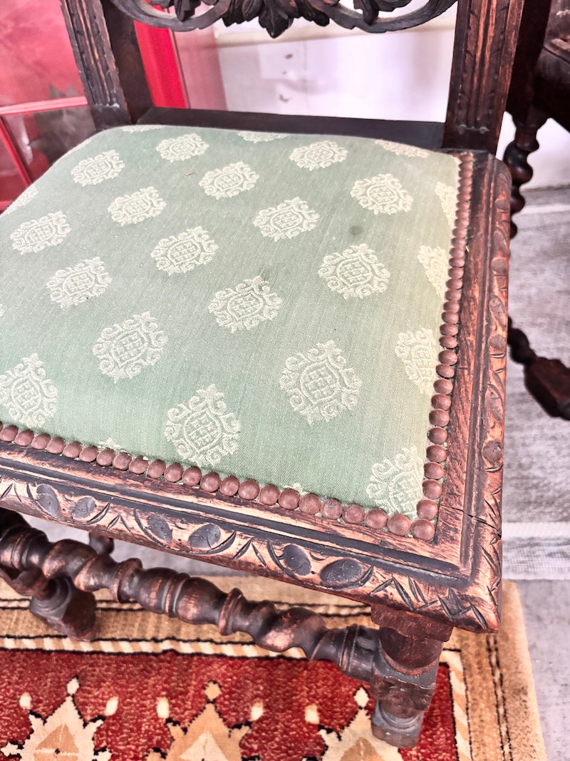 A pair of antique French Renaissance-style chairs, with ornate oak carvings of lions on the top rail, distinctive barley twist columns and elegant green upholstery on the seats and back.