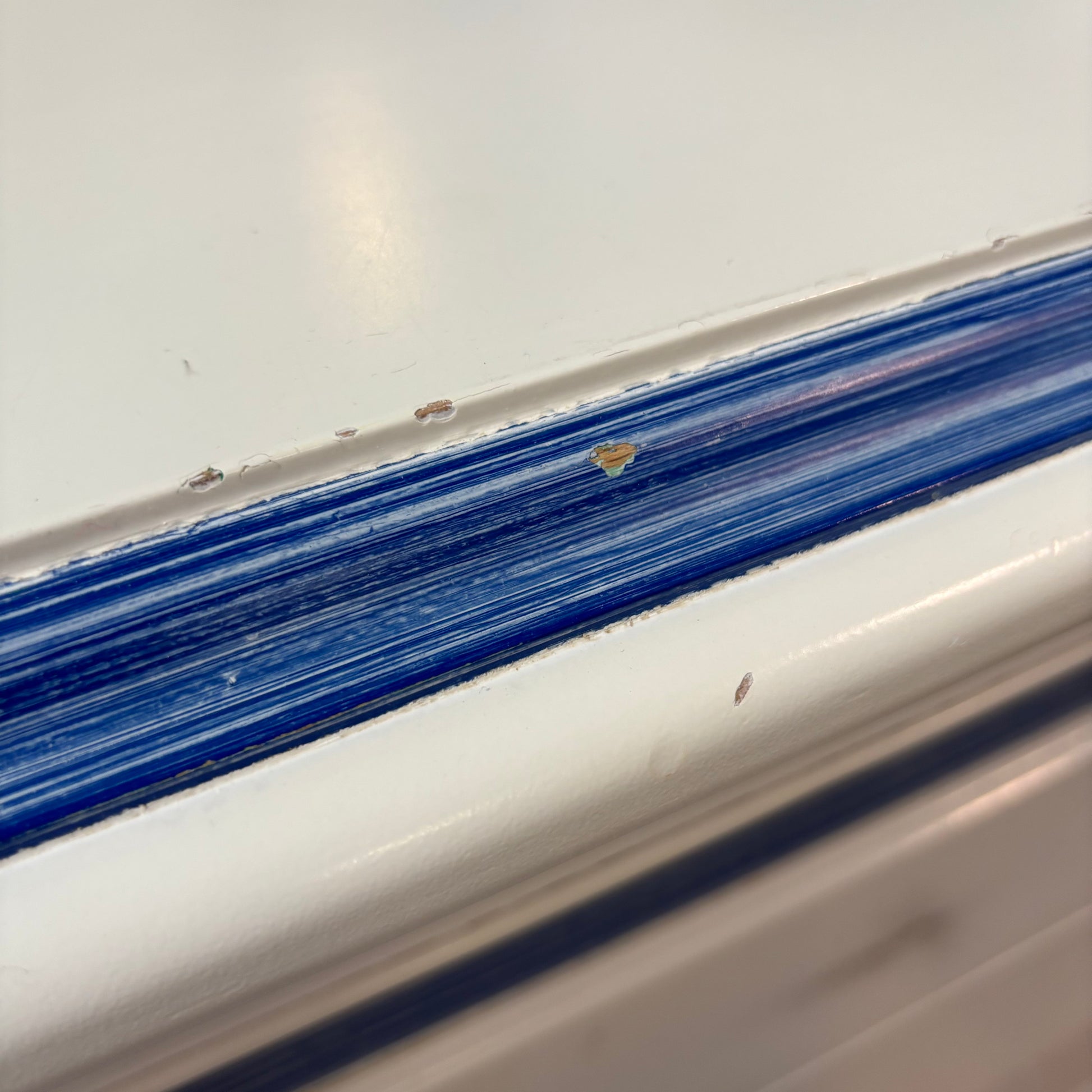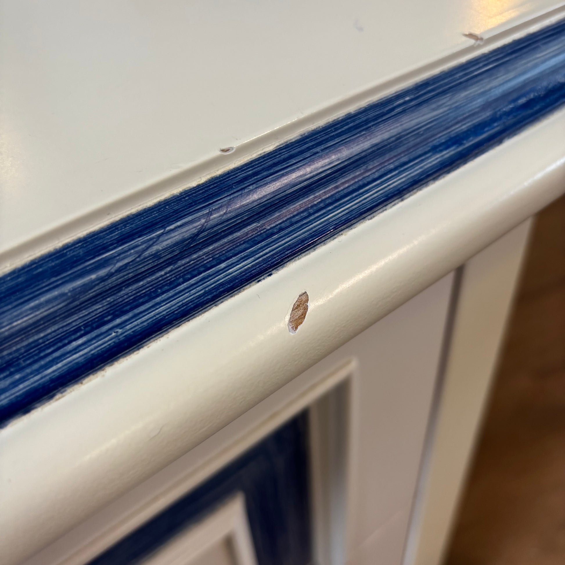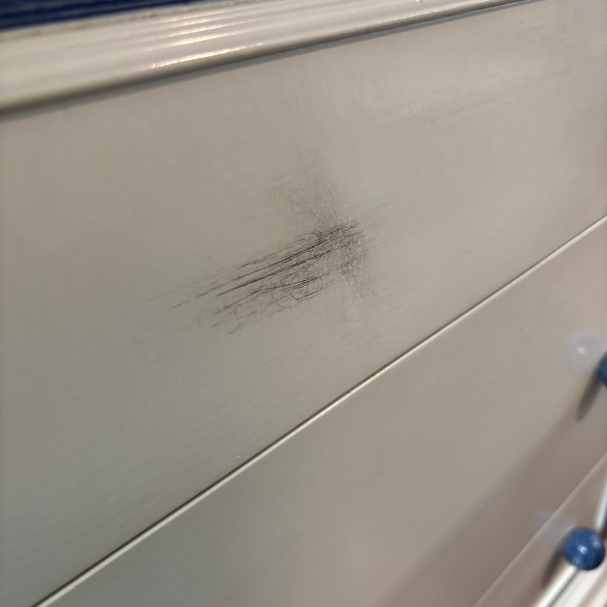 A charming chest of drawers featuring a decorative blue trim and 3 very spacious drawers. A unique piece that adds both character and storage to your space.