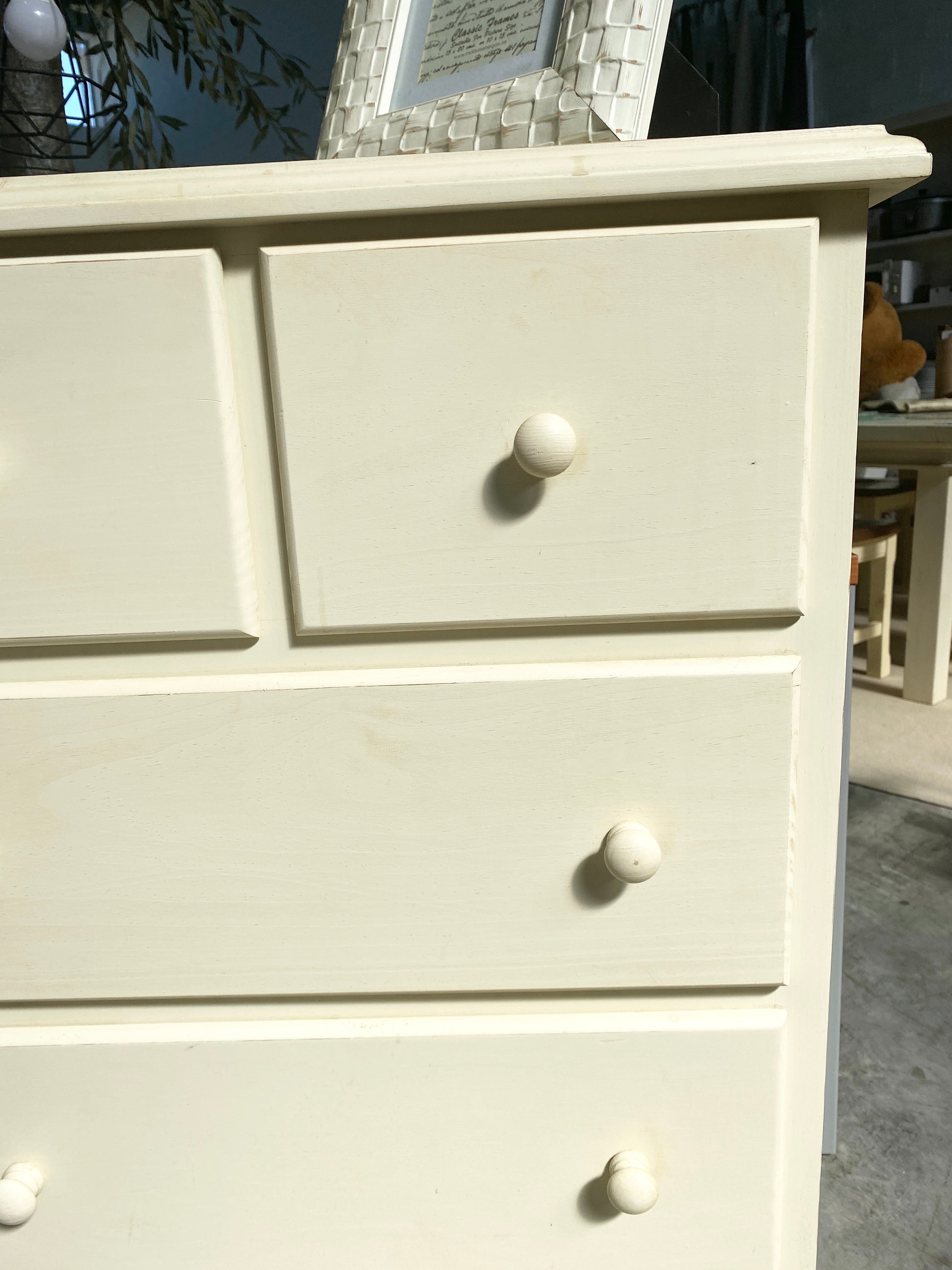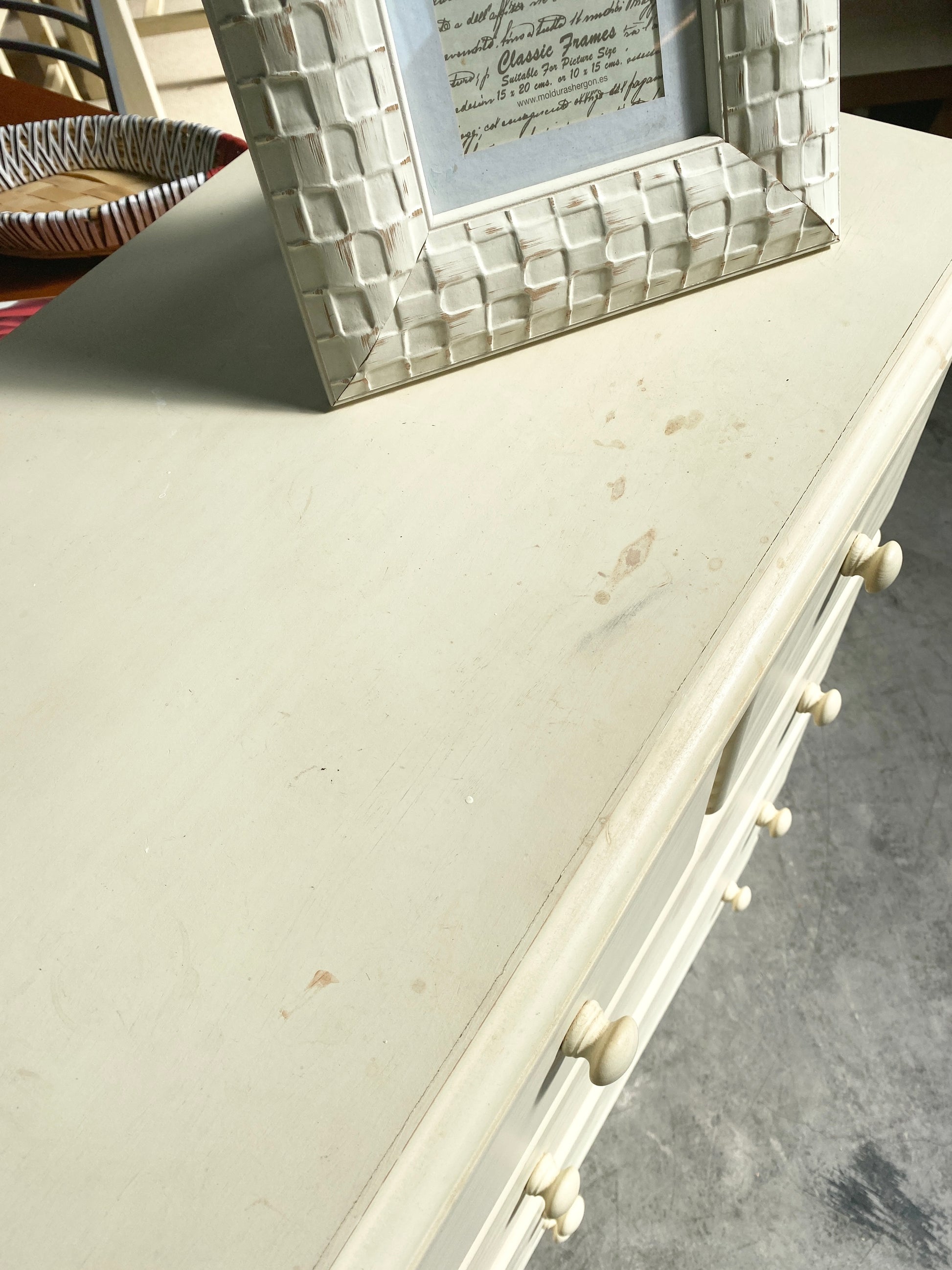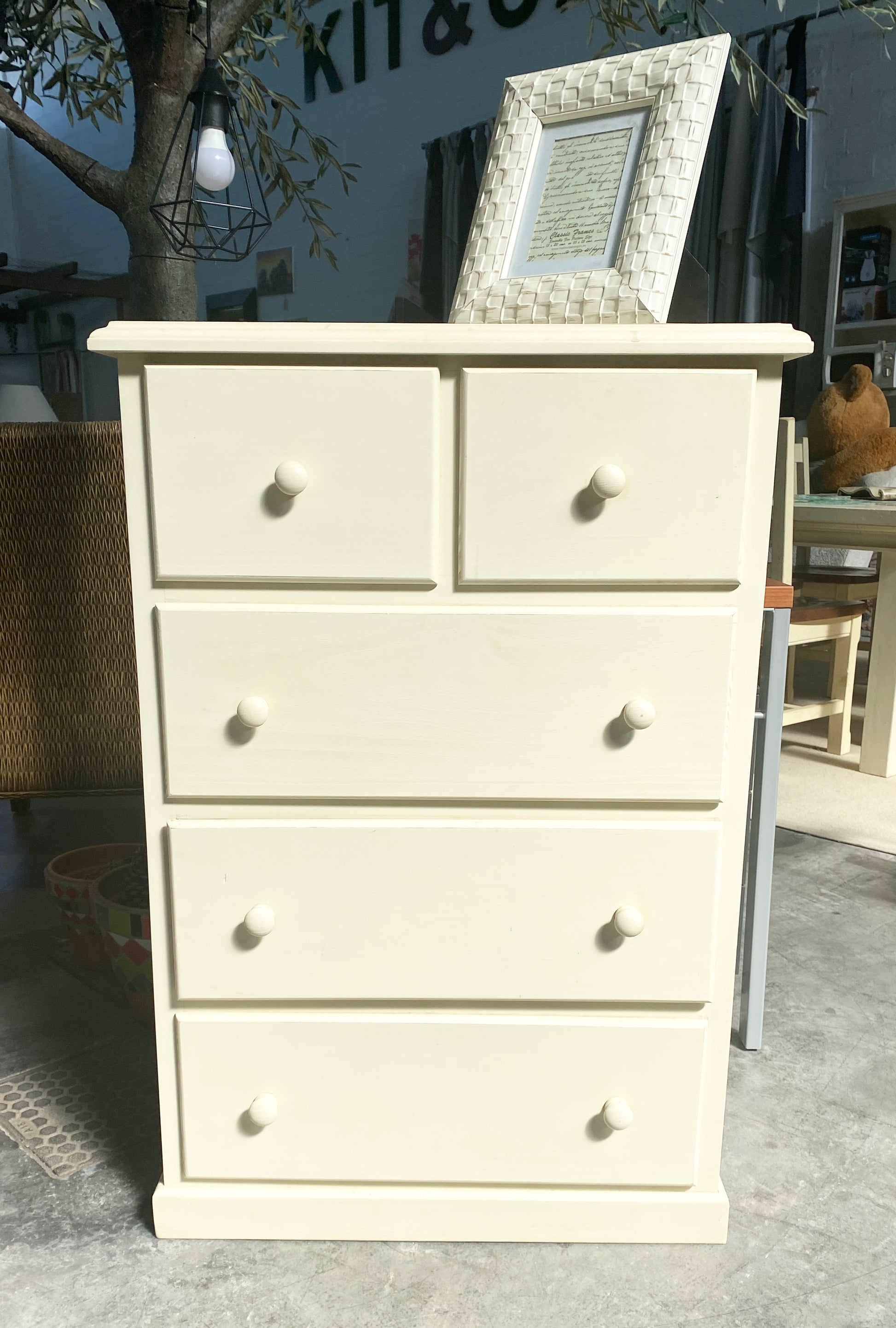 This elegant tall chest of drawers features a cream finish and includes two smaller drawers positioned above three larger ones. Each drawer offers generous depth, ensuring plenty of storage capacity. The piece shows subtle signs of wear, adding character without compromising its refined appearance.