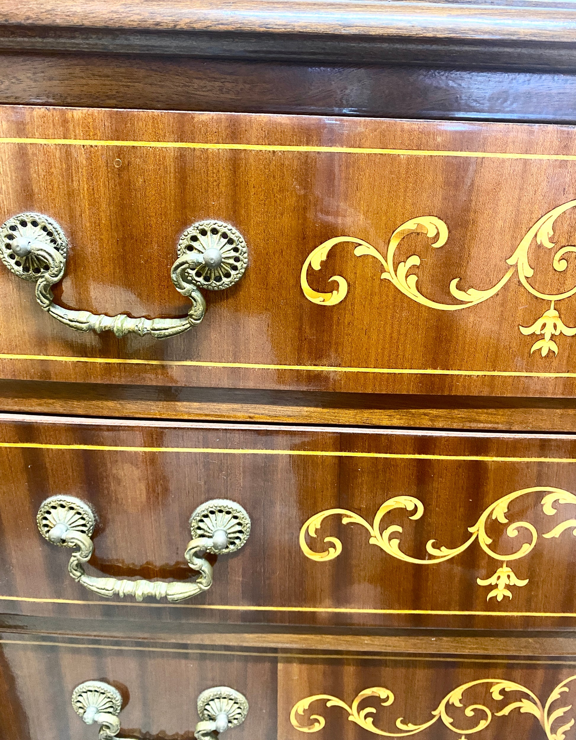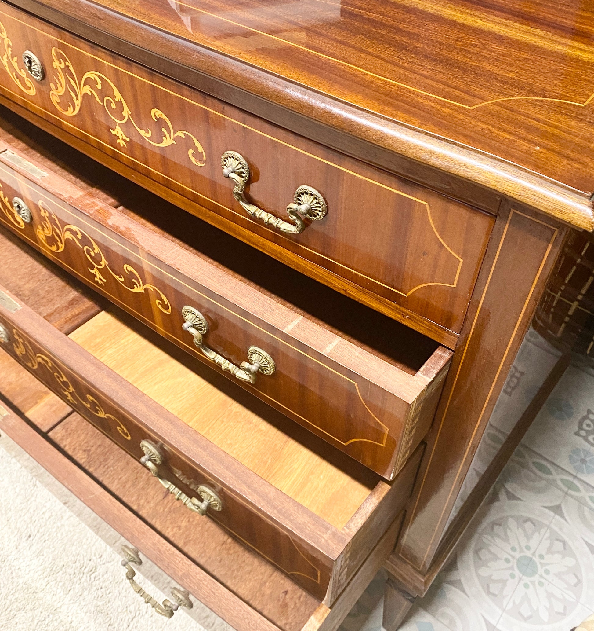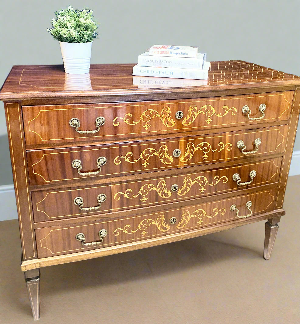 This beautiful quality Victorian reproduction chest of drawers will add a tough of elegance to your room. It offers plenty of storage in the 4 wide drawers, and has a classic appeal with "inlay" detailing and a glossy coat of varnish.