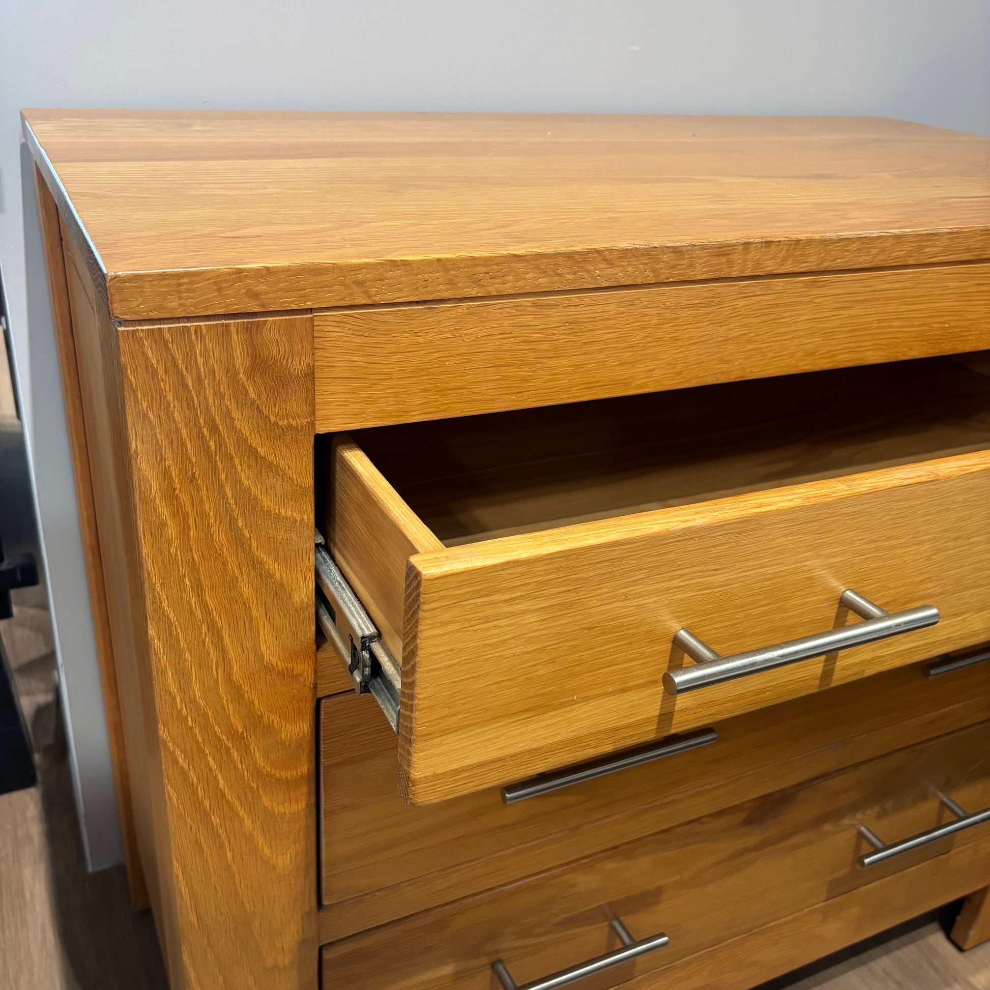 A compact warm wooden dresser with clean lines and three spacious drawers. Solid and sturdy with a natural finish that fits almost any room.