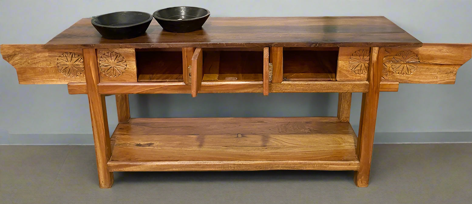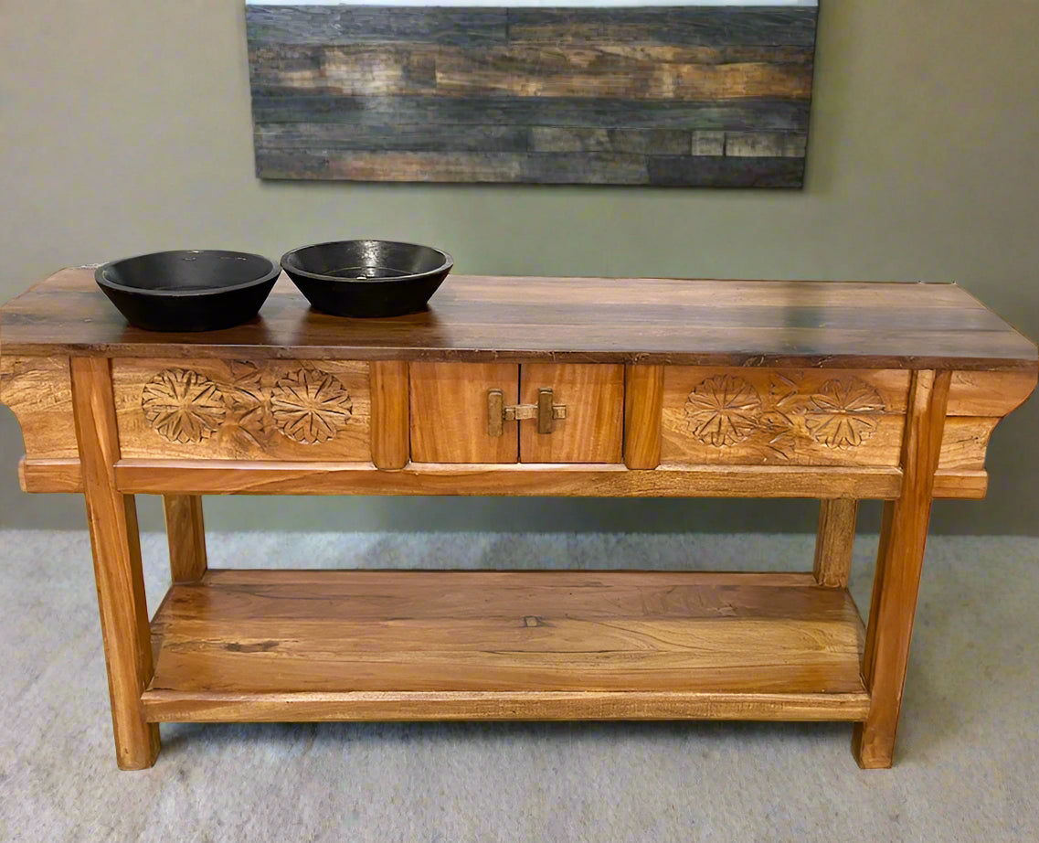 Having had the good fortune to acquire some pieces direct from Indian and Balinese Craftsmen, through an interior designer, we are proud to offer this piece for sale at a very low price. Skillfully built and carved from solid wood with an attractive grain pattern, this console is of exceptional quality and offers carefully hidden storage behind the sliding panels.