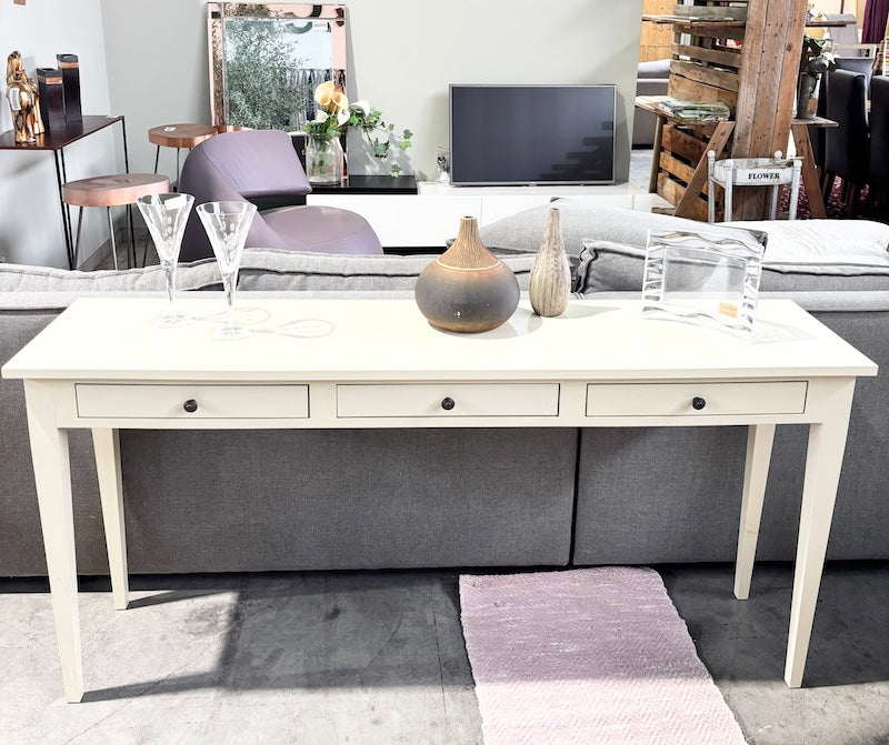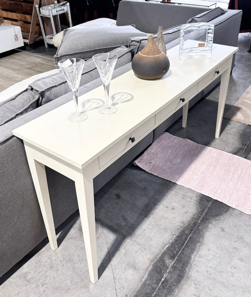 Refined white console table with three shallow drawers, designed for functional elegance in transitional spaces. Ideal for organizing essentials while maintaining a clean, uncluttered aesthetic.