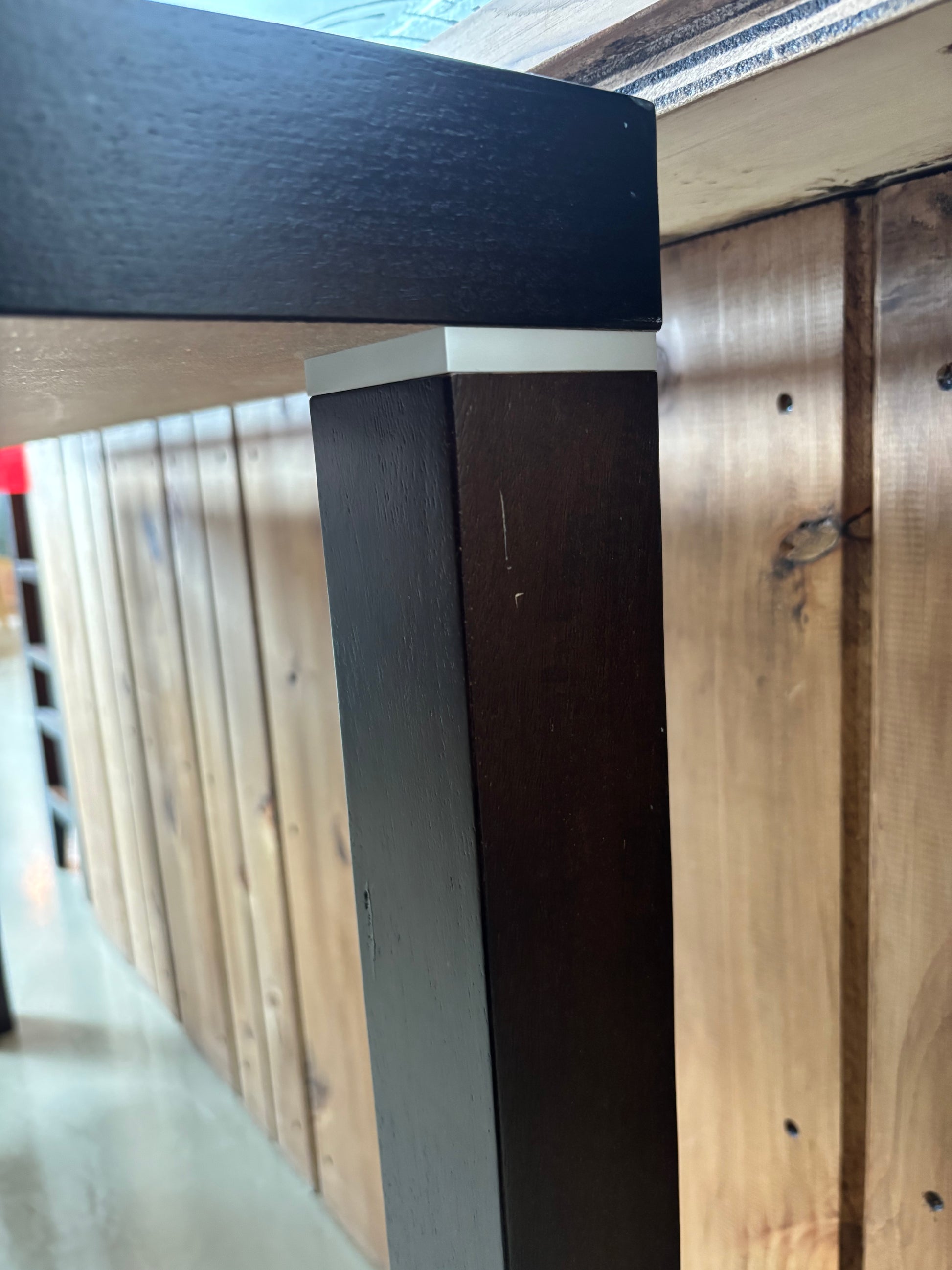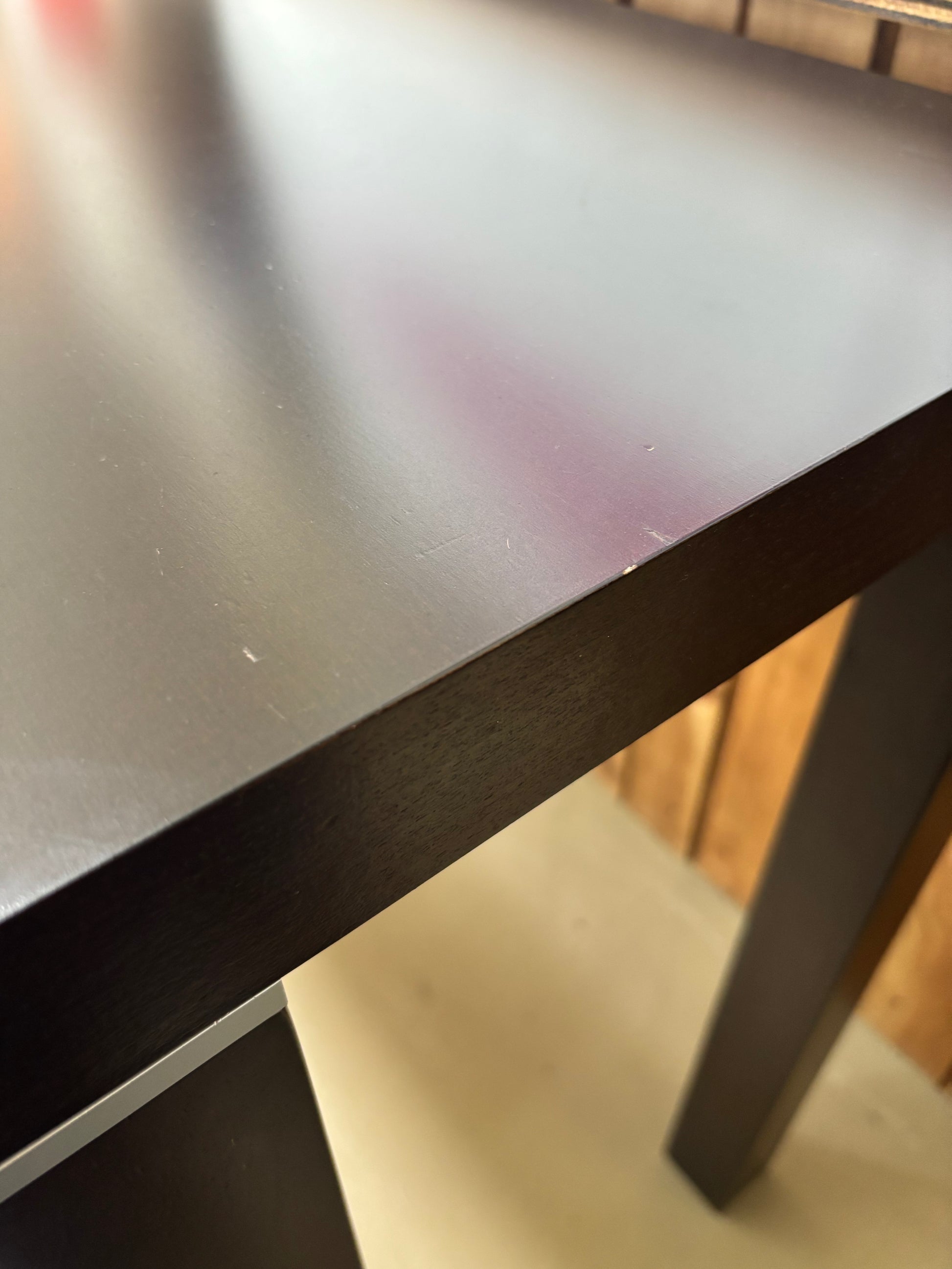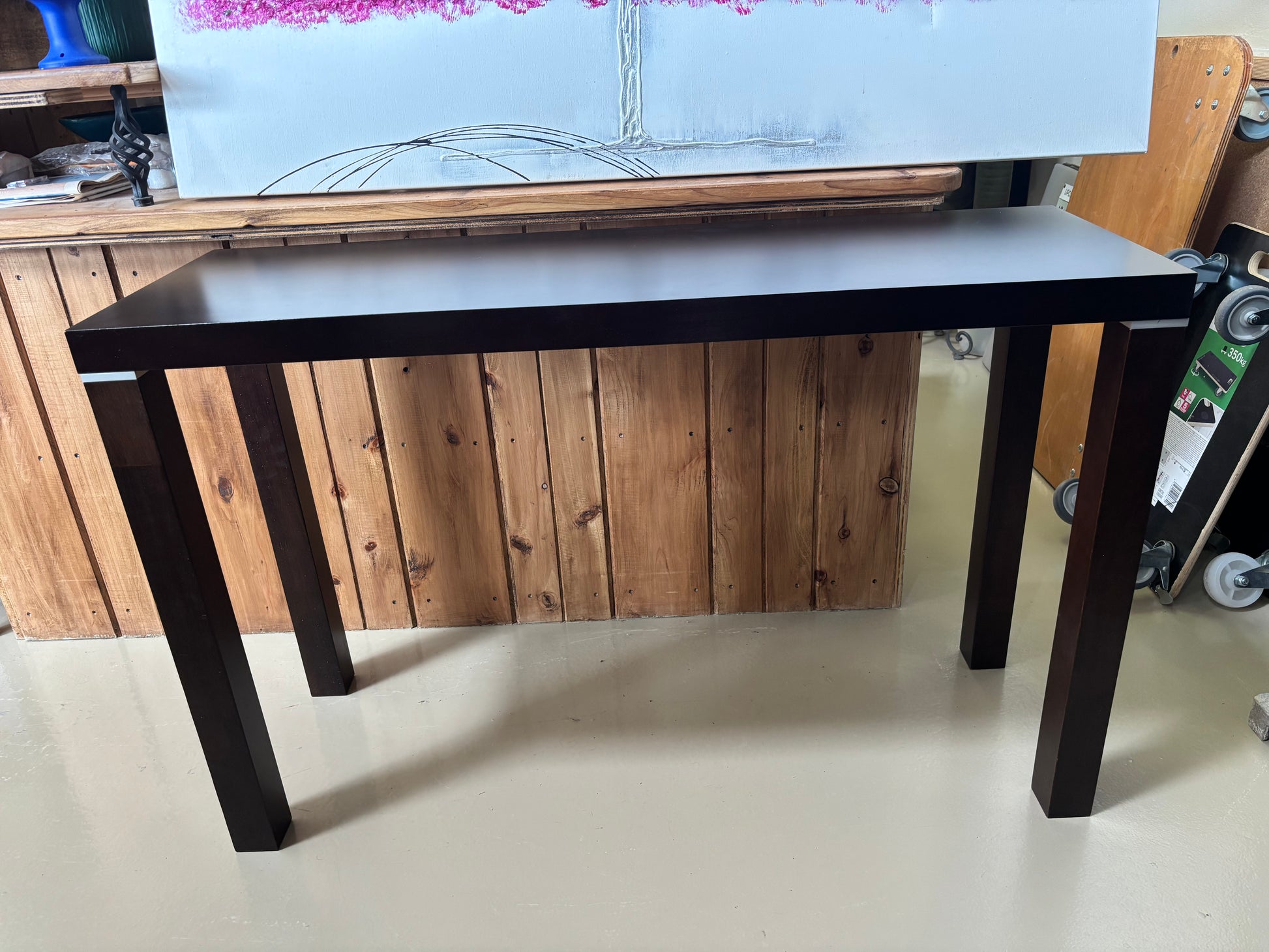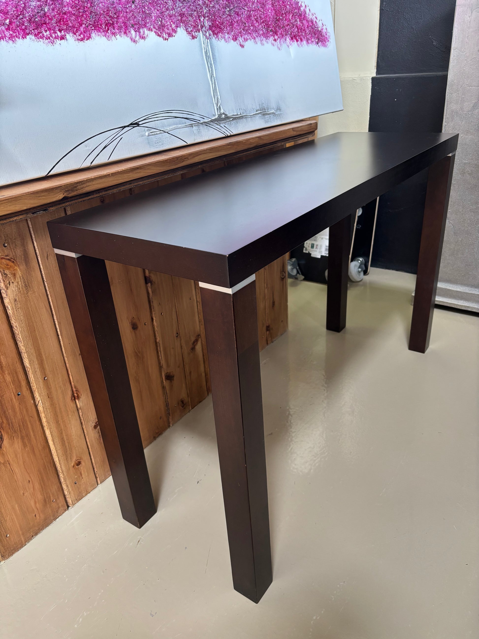 Sleek black console table with clean lines and silver coloured detailing. Ideal for an entryway, hallway, or behind a sofa.