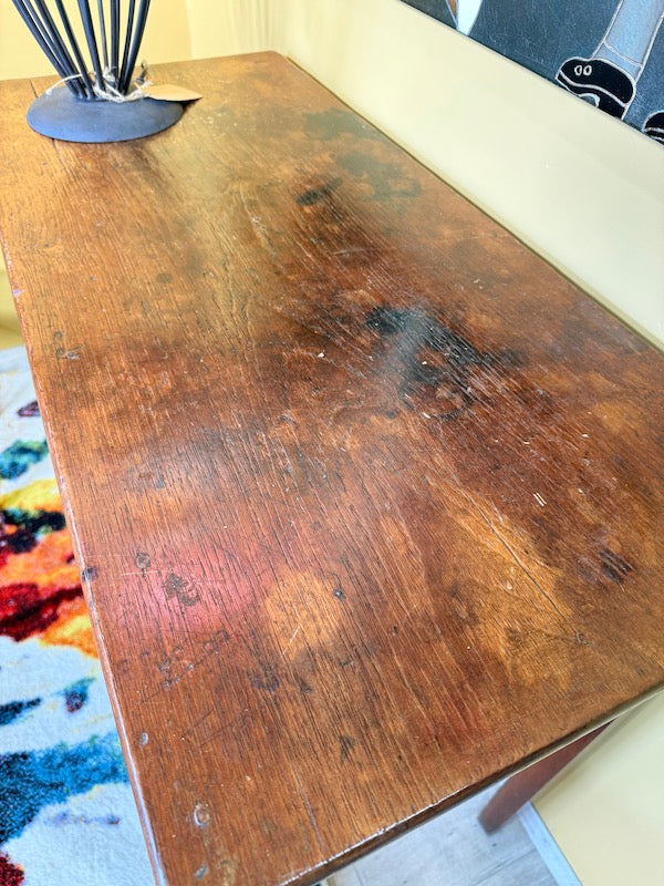lim solid wooden console table with a single drawer and classic straight legs. Shows signs of age and use, giving it an appealing rustic character. Ideal for adding a bit of old-school charm to your hallway or workspace.