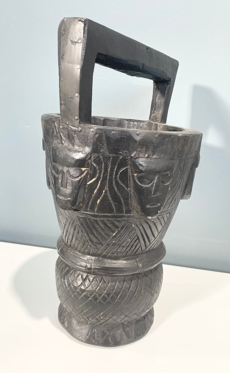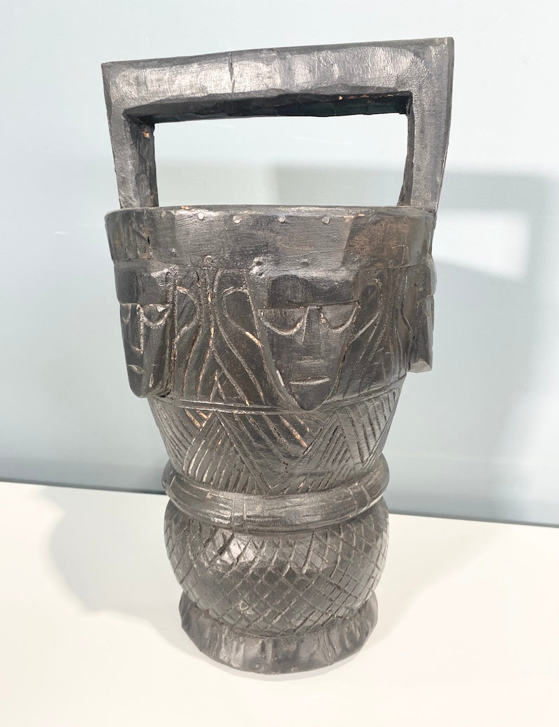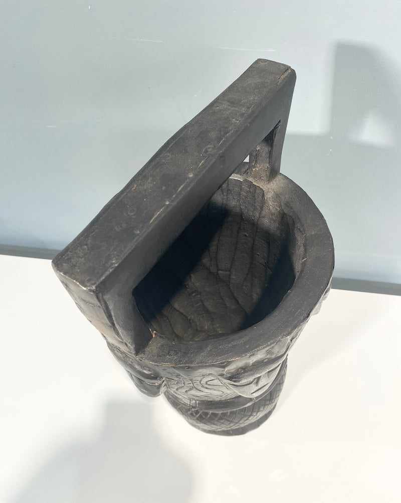 A single piece of wood carved into a bucket shape and painted black, with carved images or faces and abstract lines decorating it.