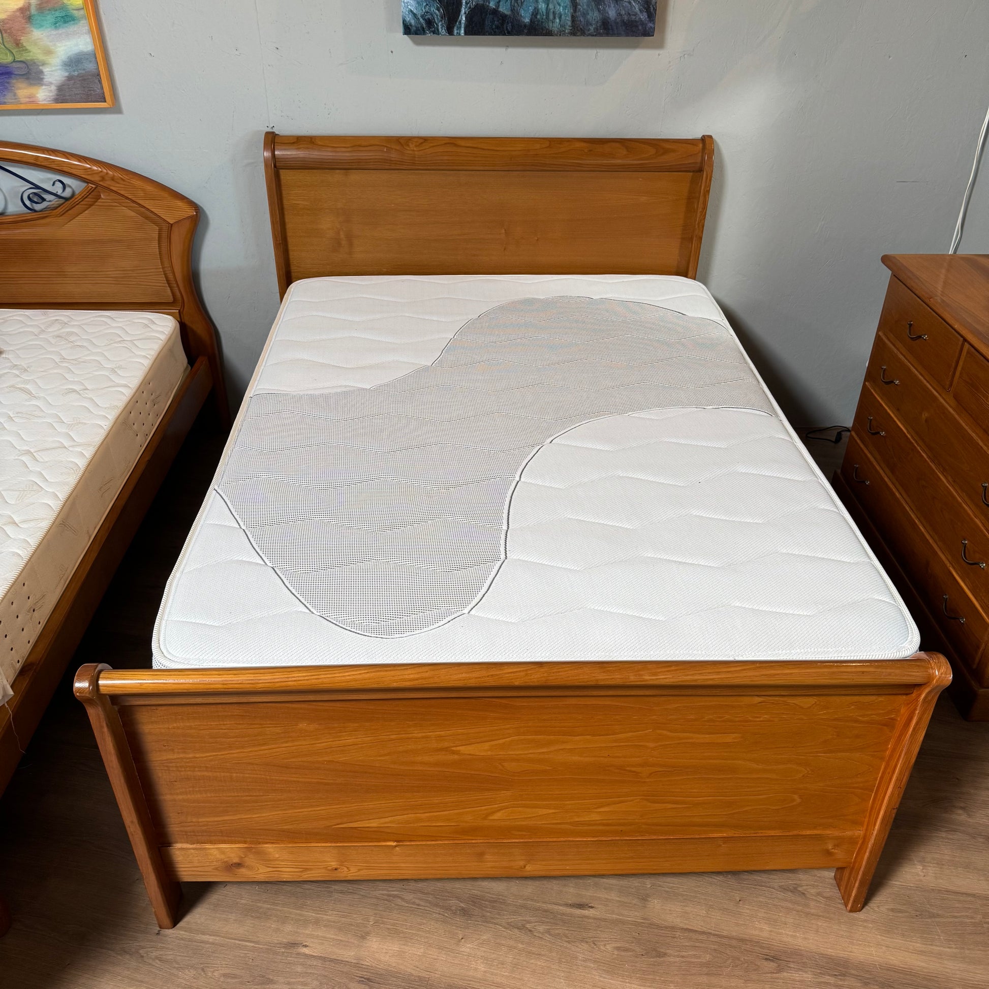 Classic wooden double bed frame with a warm finish and decorative curved head and footboard detail. Sturdy, timeless design.