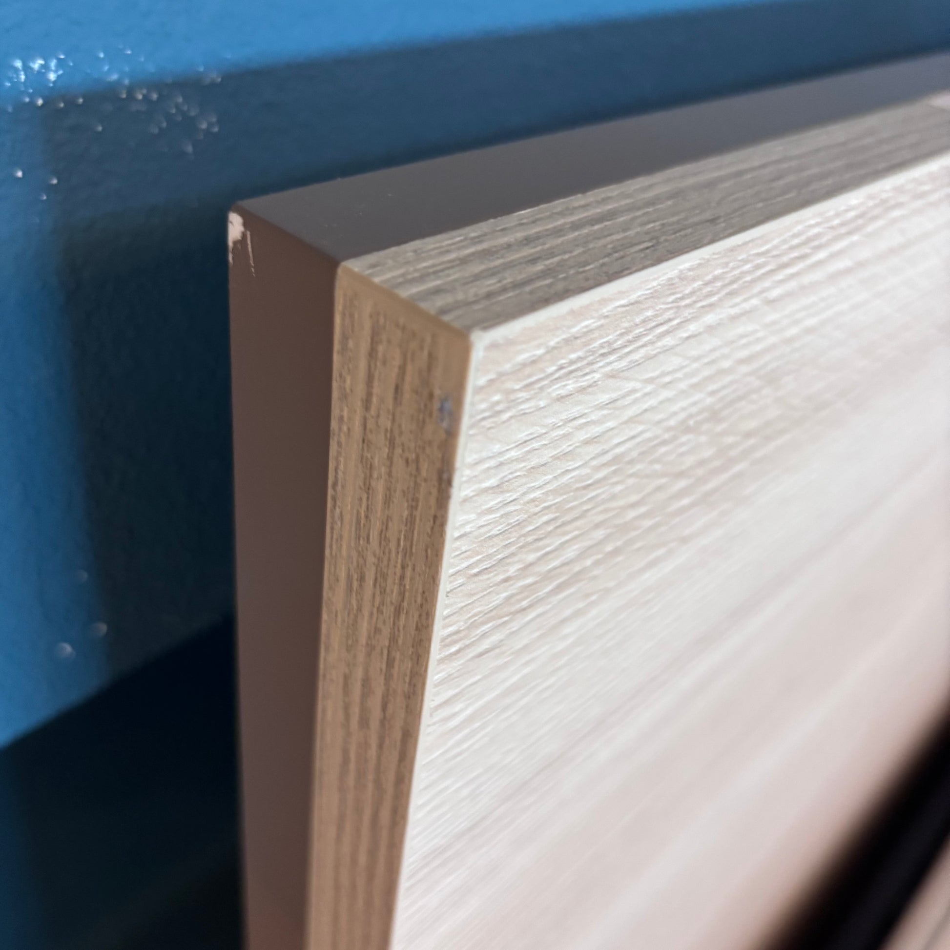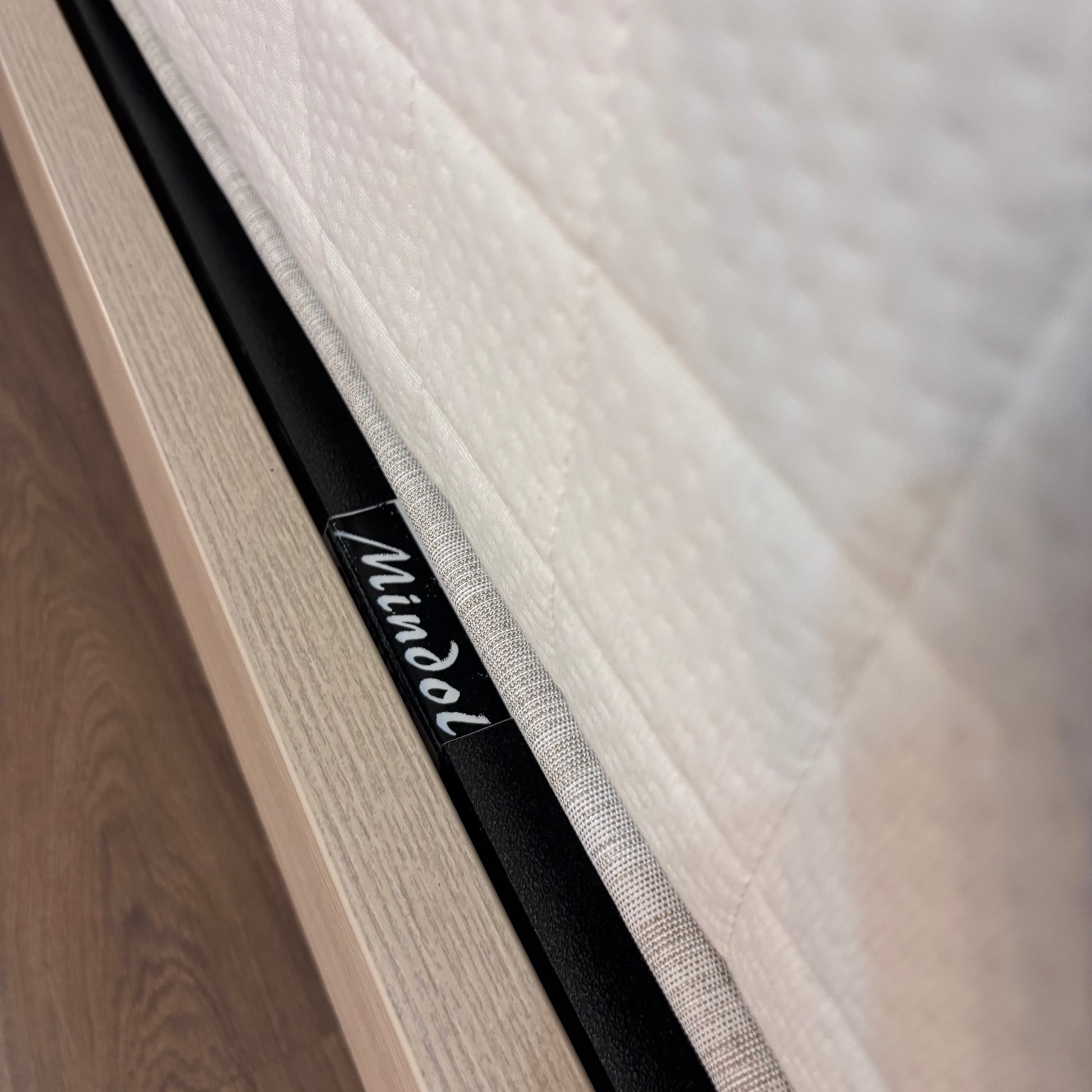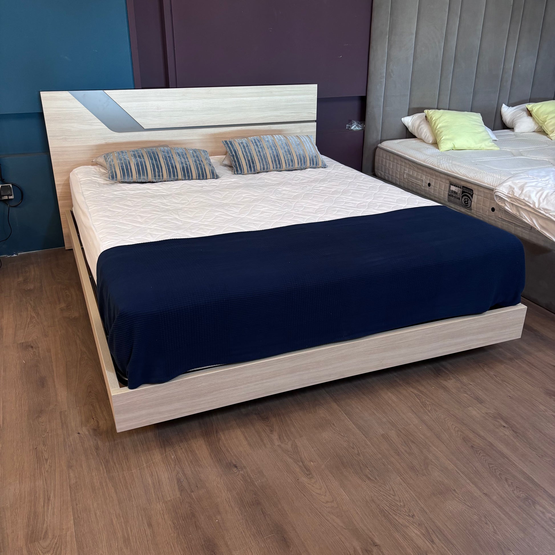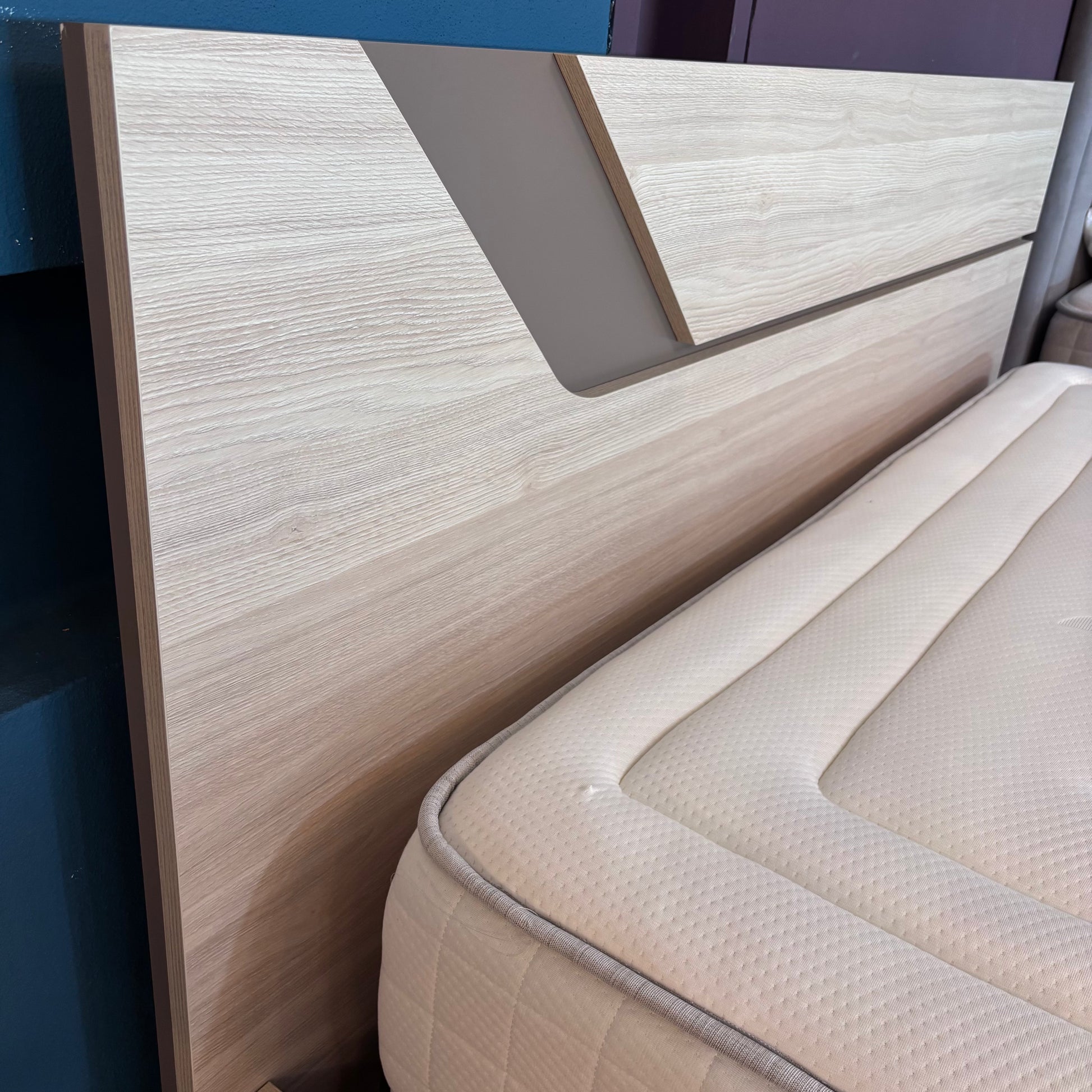 Modern light-wood veneer double bed with a sleek design and a comfortable mattress. Ideal for upgrading a bedroom with a simple, stylish setup.