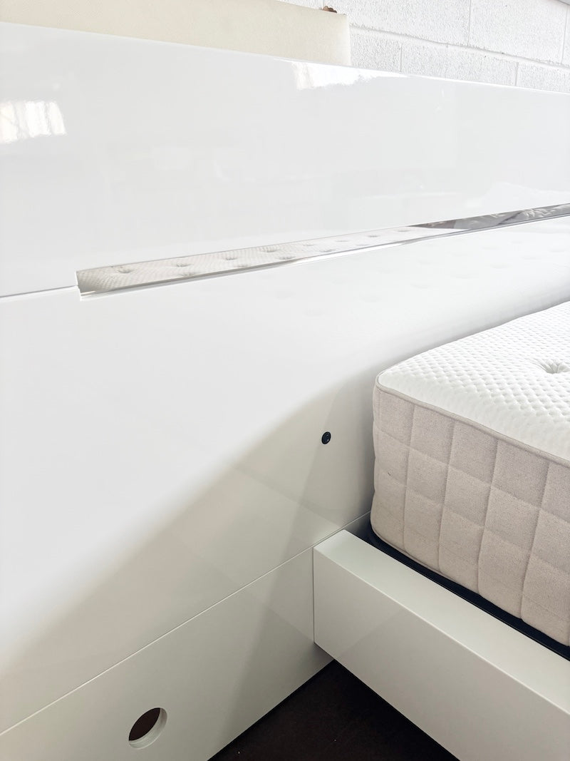 Discover this striking white double bed featuring an extended integrated headboard with ambient lighting—perfect for creating a polished bedroom focal point. The spacious headboard extends behind your bedside tables, maximising both style and functionality. Finished in crisp white with a quality mattress included, this bed combines comfort with contemporary design.