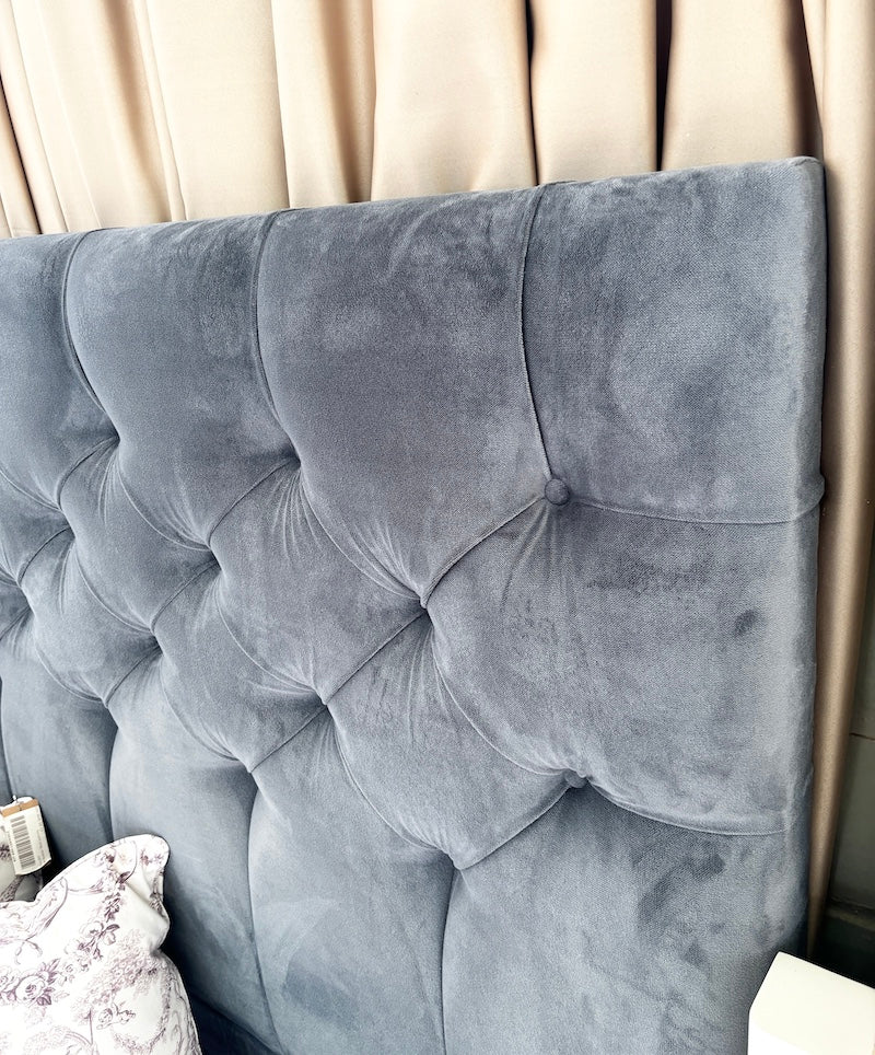 This double bed features a comfortable IKEA mattress on a pair of single divan bases with a plush blue velvet headboard with button tufting.