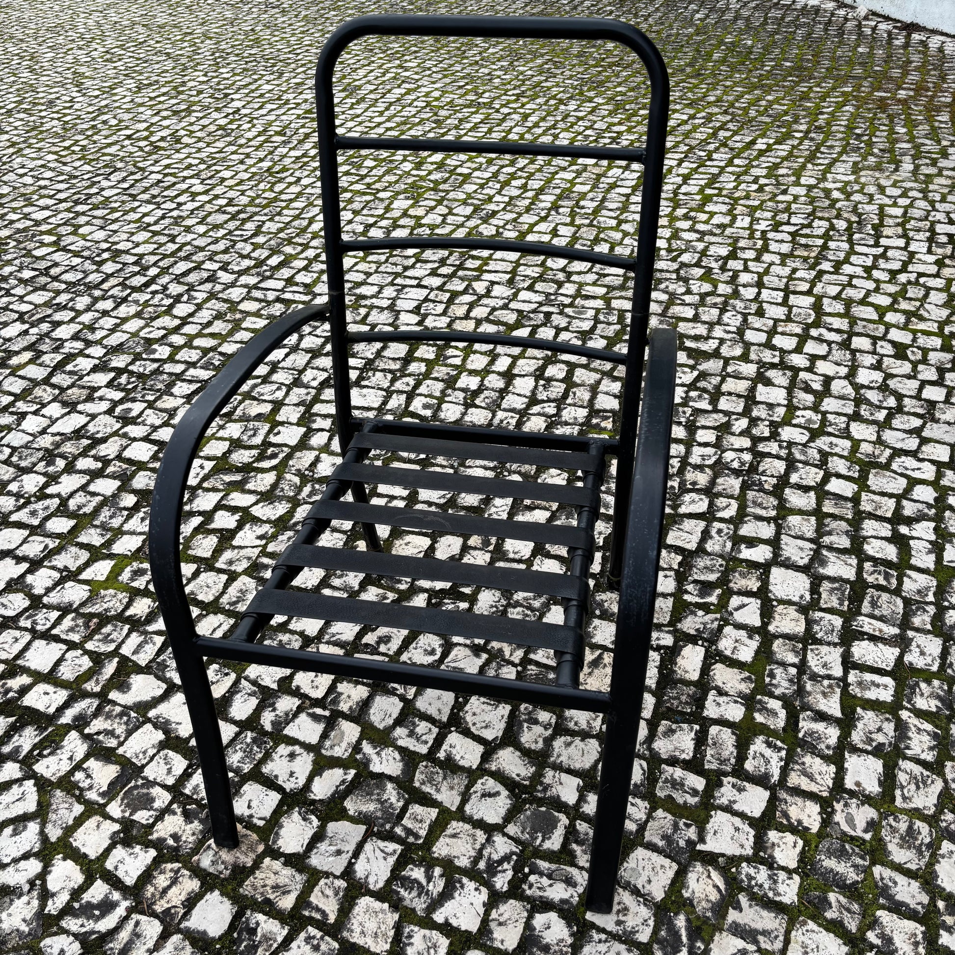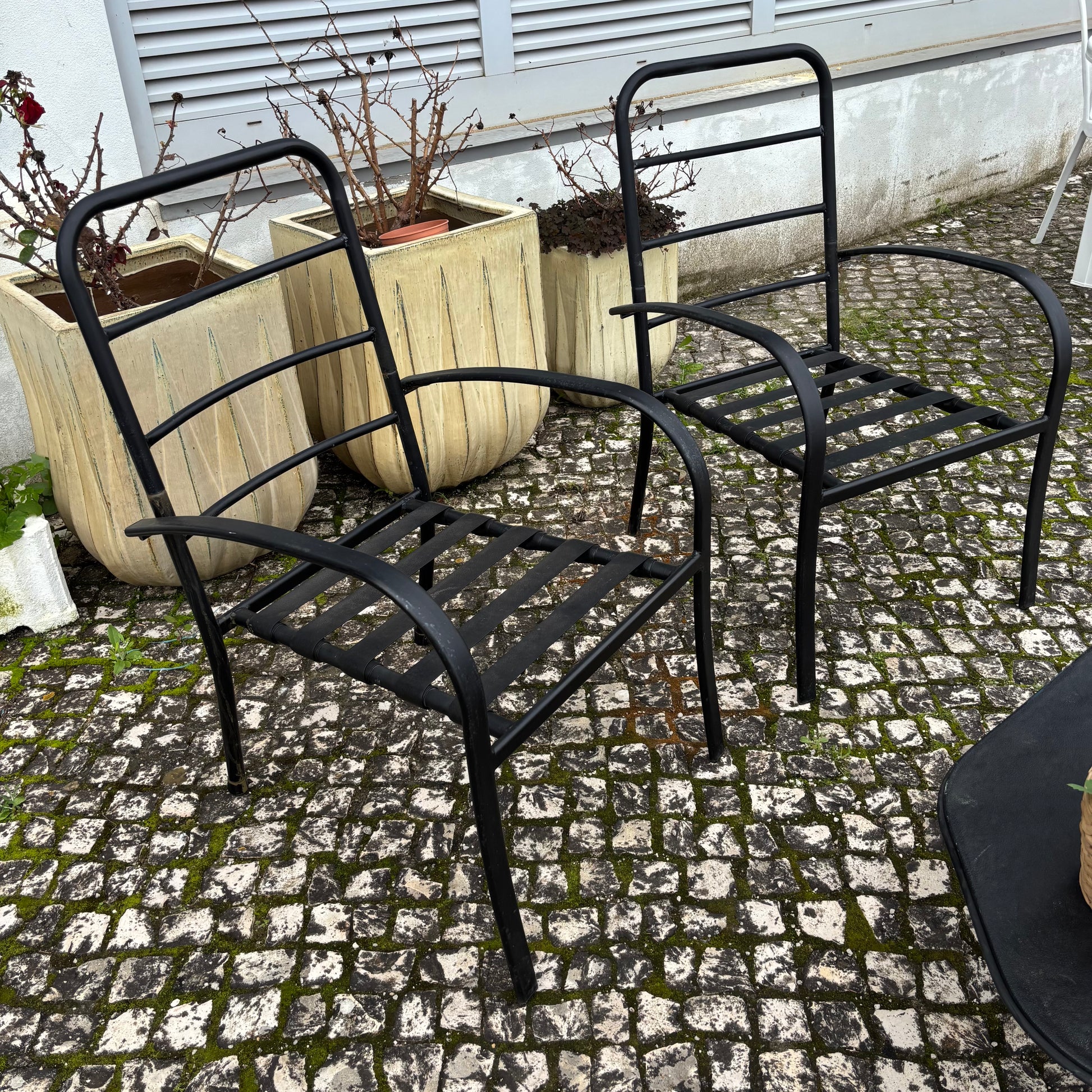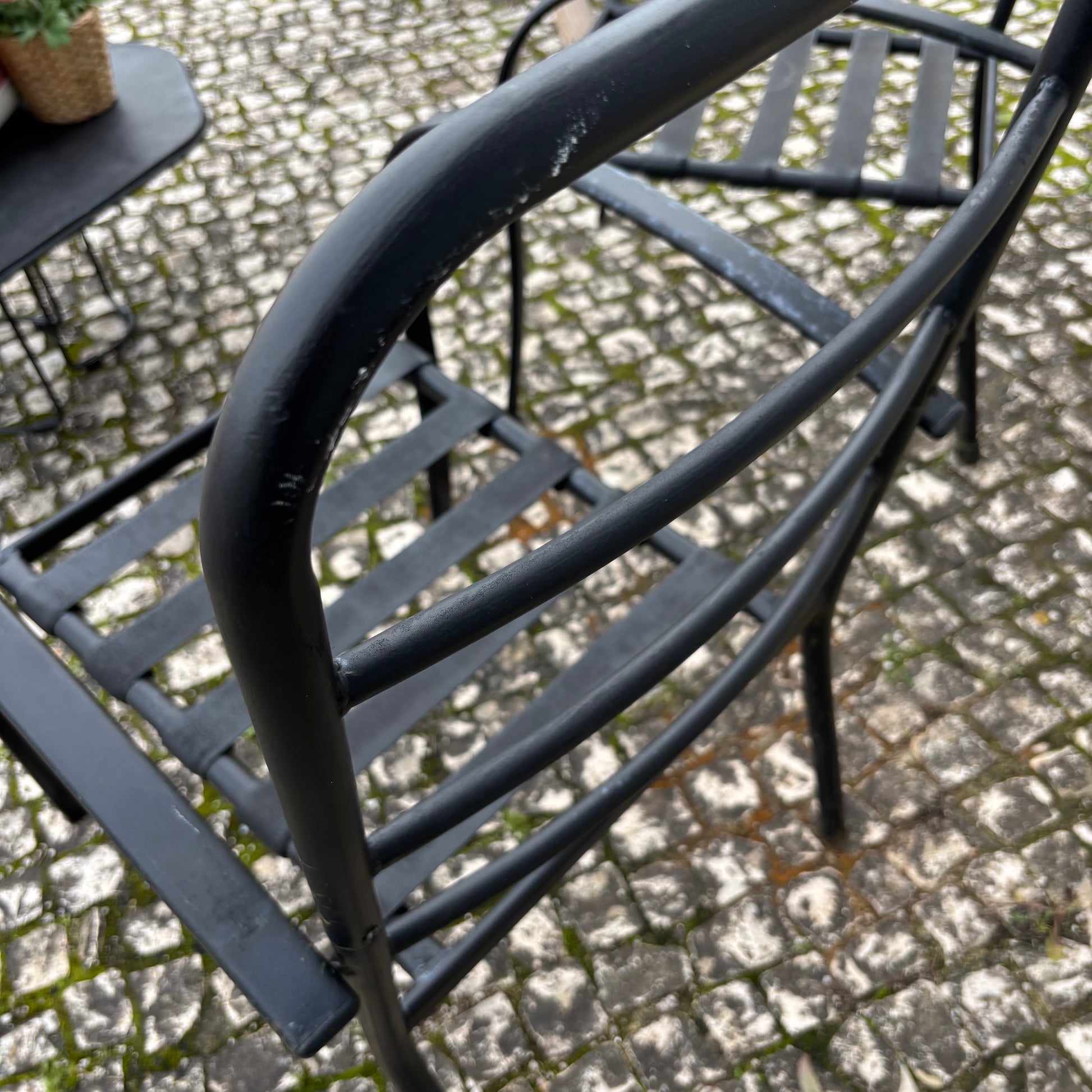 A sleek and minimalist outdoor set featuring black metal chairs with a leather feel fabric, paired with a matching coffee table. With clean lines and a lightweight yet sturdy frame, this set is perfect for balconies, terraces or café-style spaces, adding a modern industrial touch to any outdoor setting.