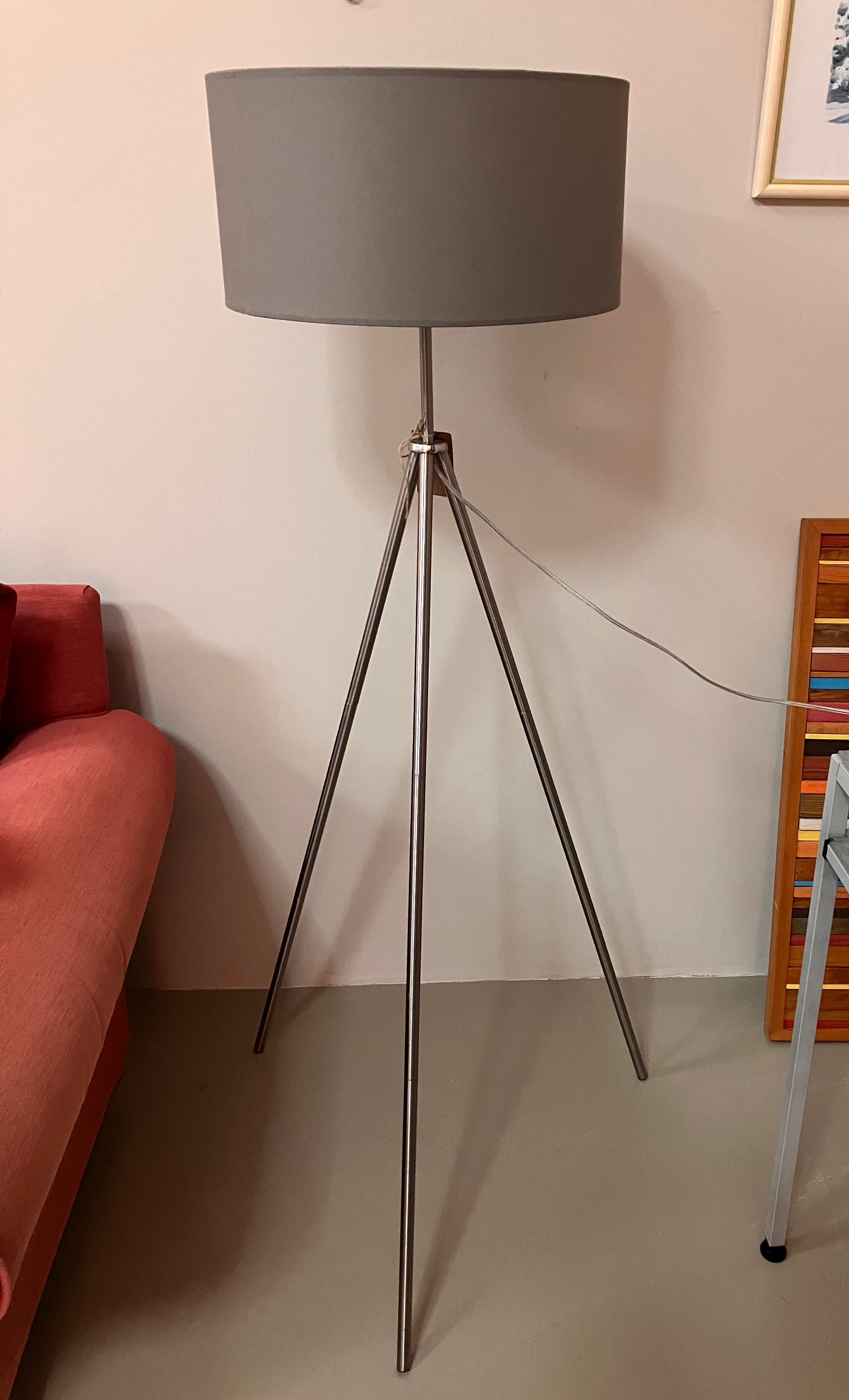 A modern floor lamp from Eglo with a minimalist design. It has a tripod base in metallic silver and a cylindrical beige lampshade.