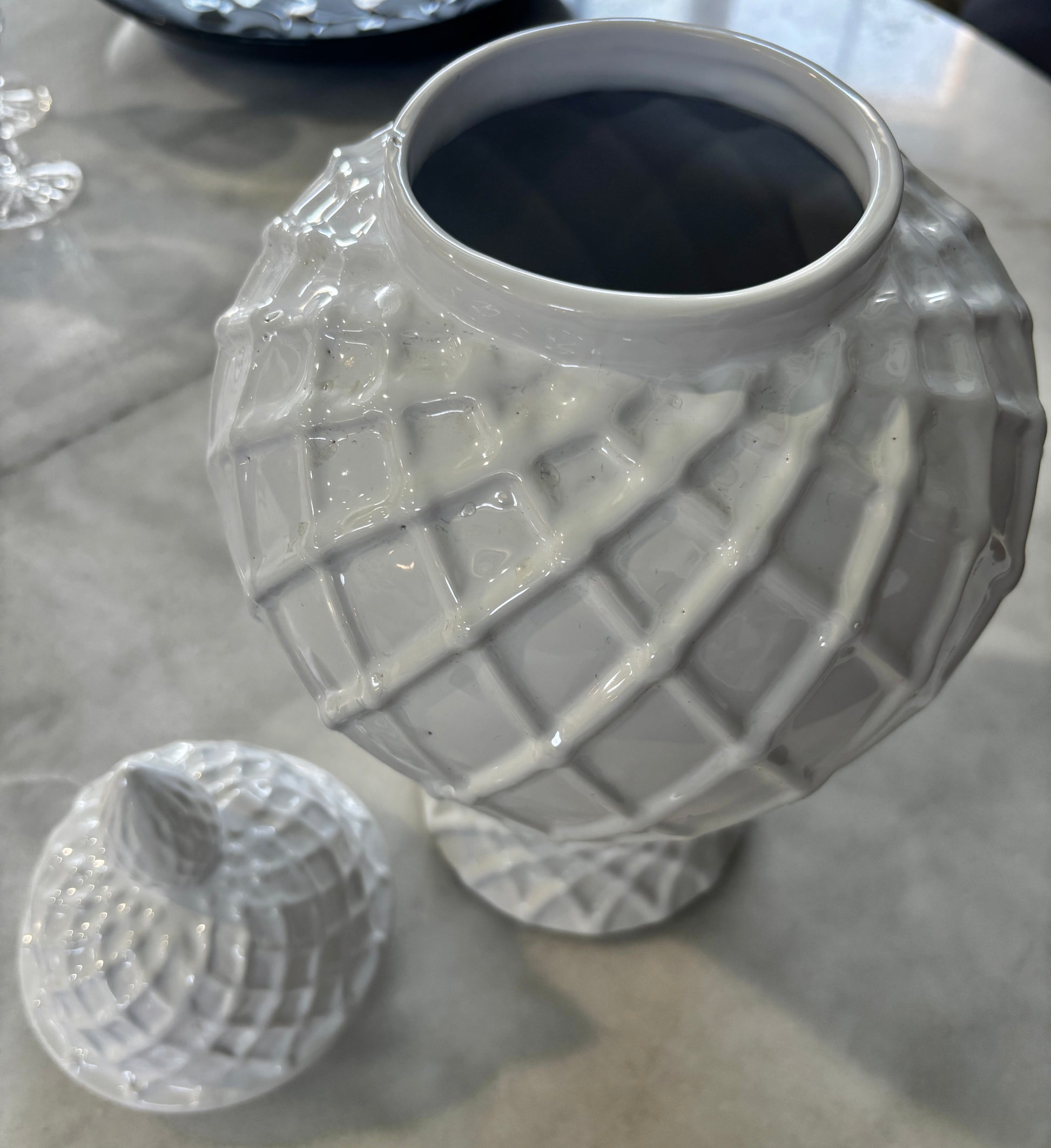 This elegant ceramic ginger jar complete with a lid has a cris cross diamond relief pattern and is finished with a thick white glaze.