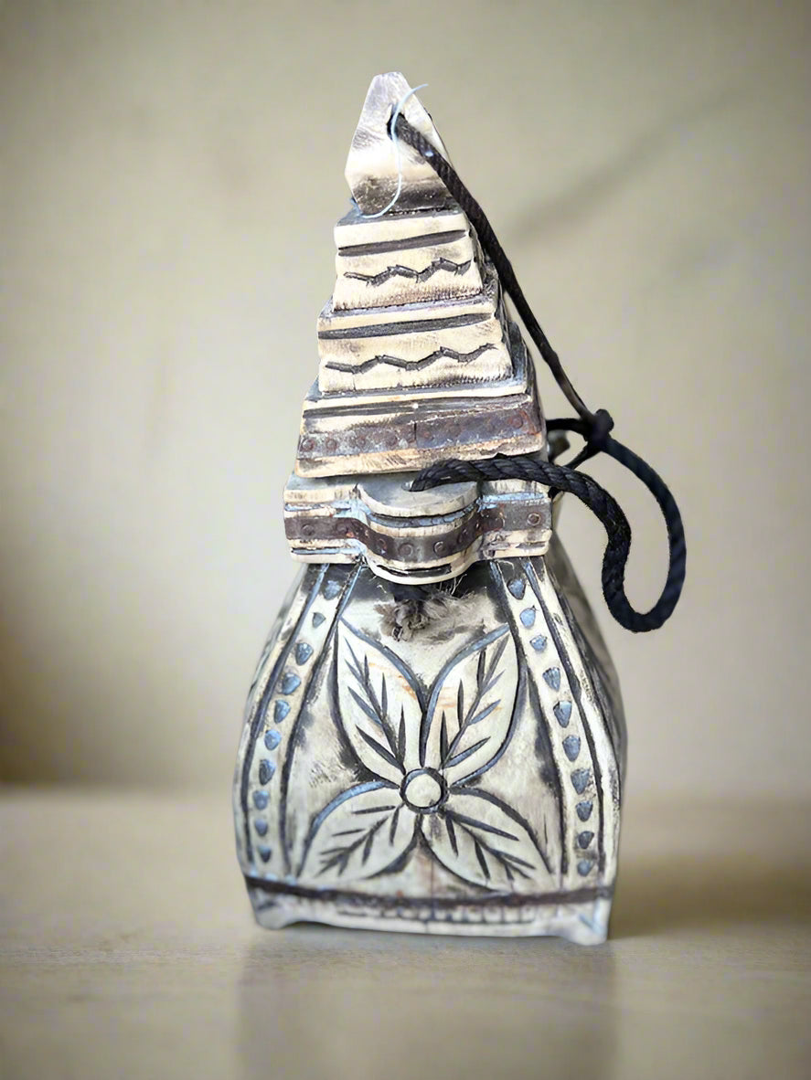 This beautifully handcrafted oil dispenser combines functionality with artistic charm. Made from carved wood, it features intricate floral and geometric patterns that give it a rustic, traditional appeal. The pyramid-style top and natural finish evoke old-world craftsmanship, while the sturdy rope handle adds both utility and character.