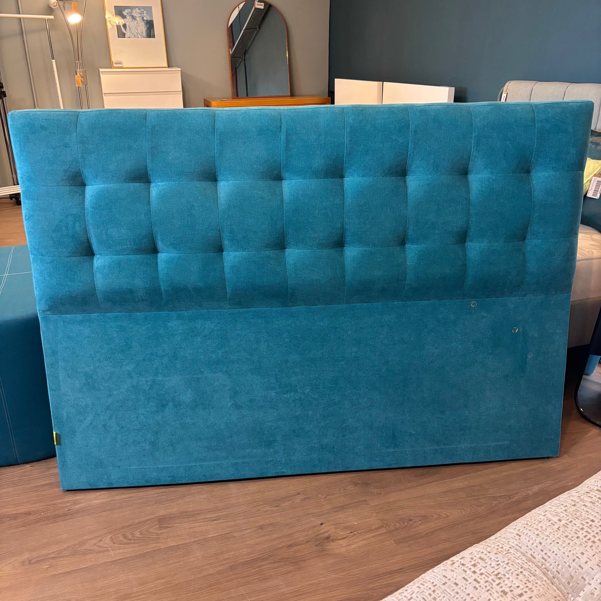 Stylish upholstered headboard in a rich teal velvet with elegant tufted detailing. A beautiful statement piece that adds a pop of color and comfort to any bedroom.