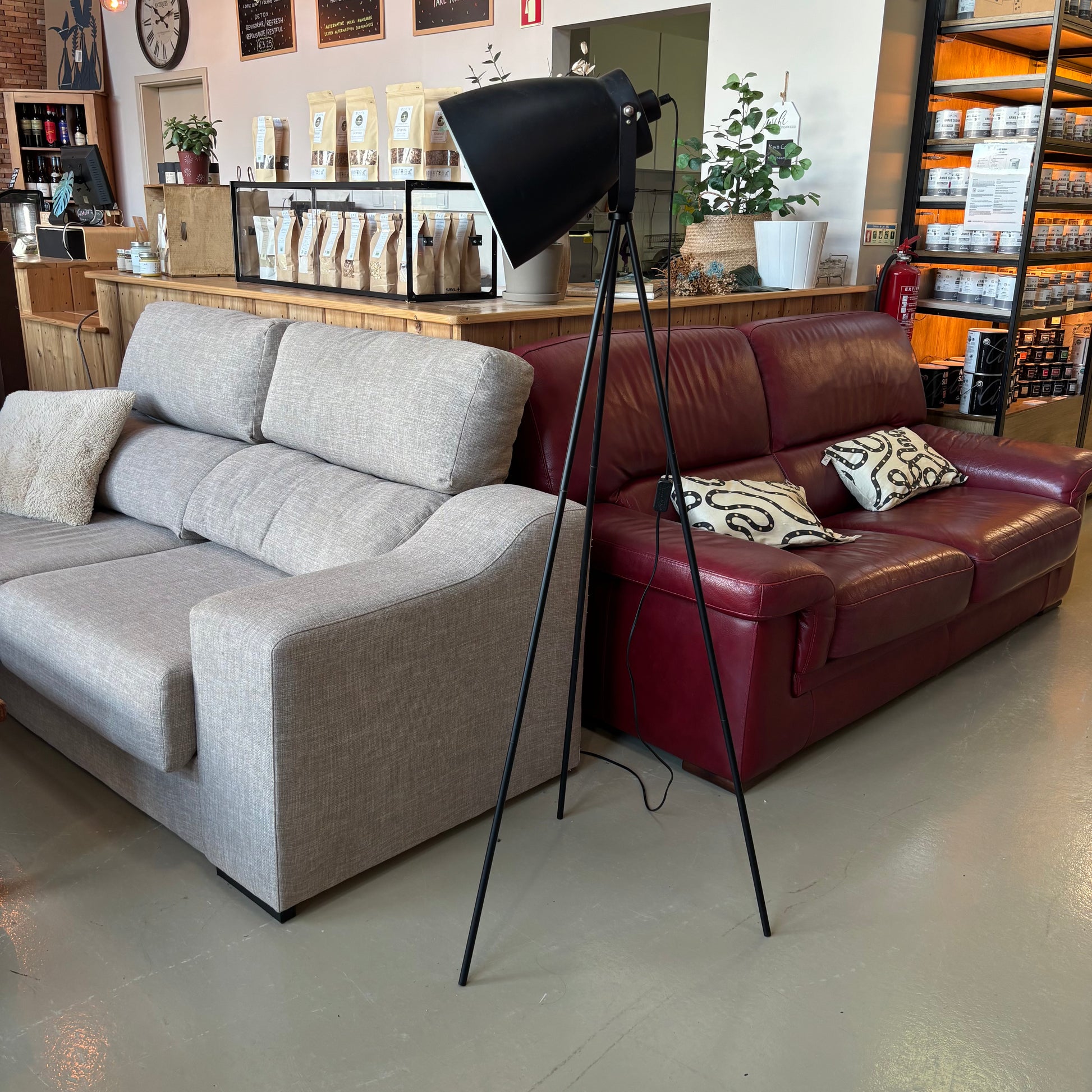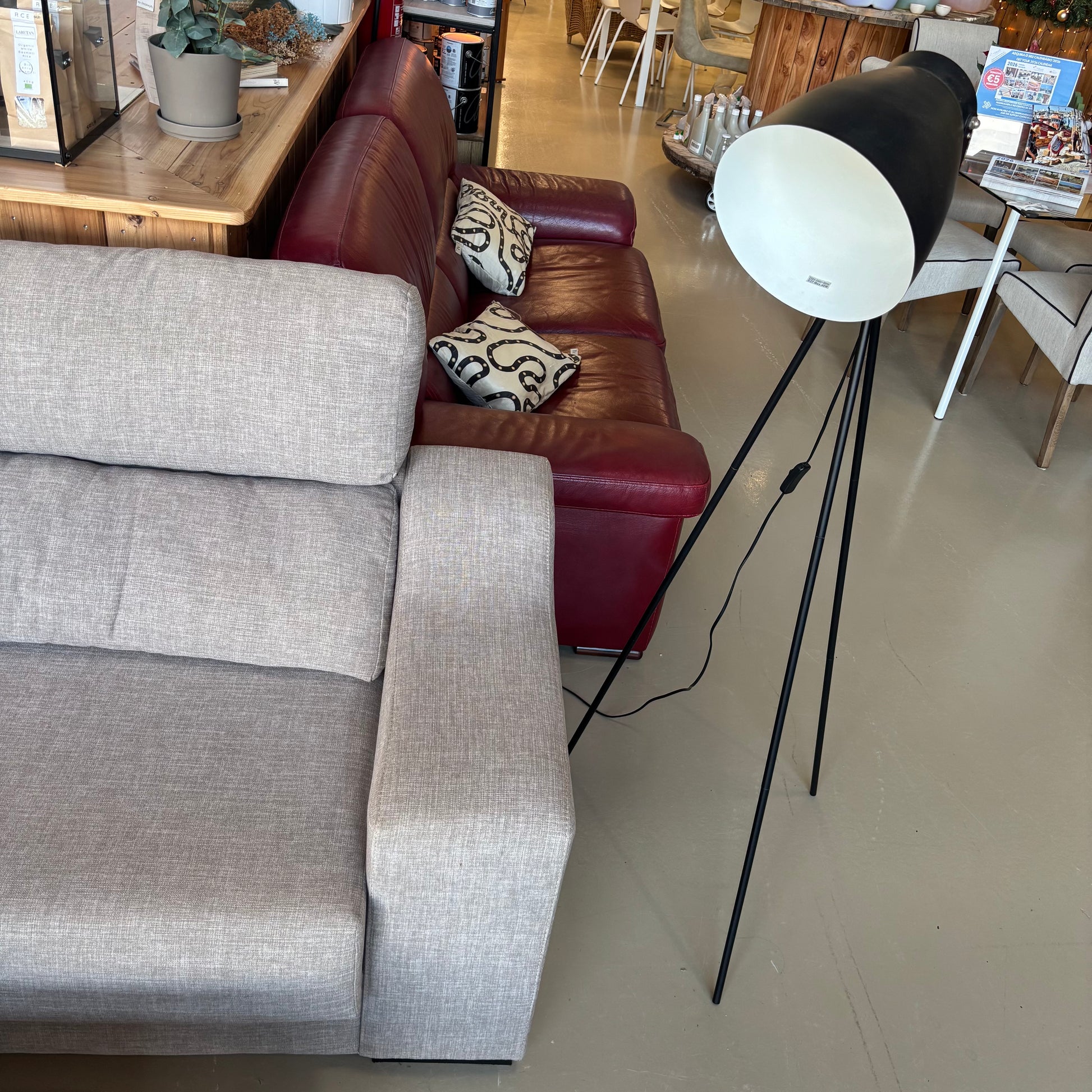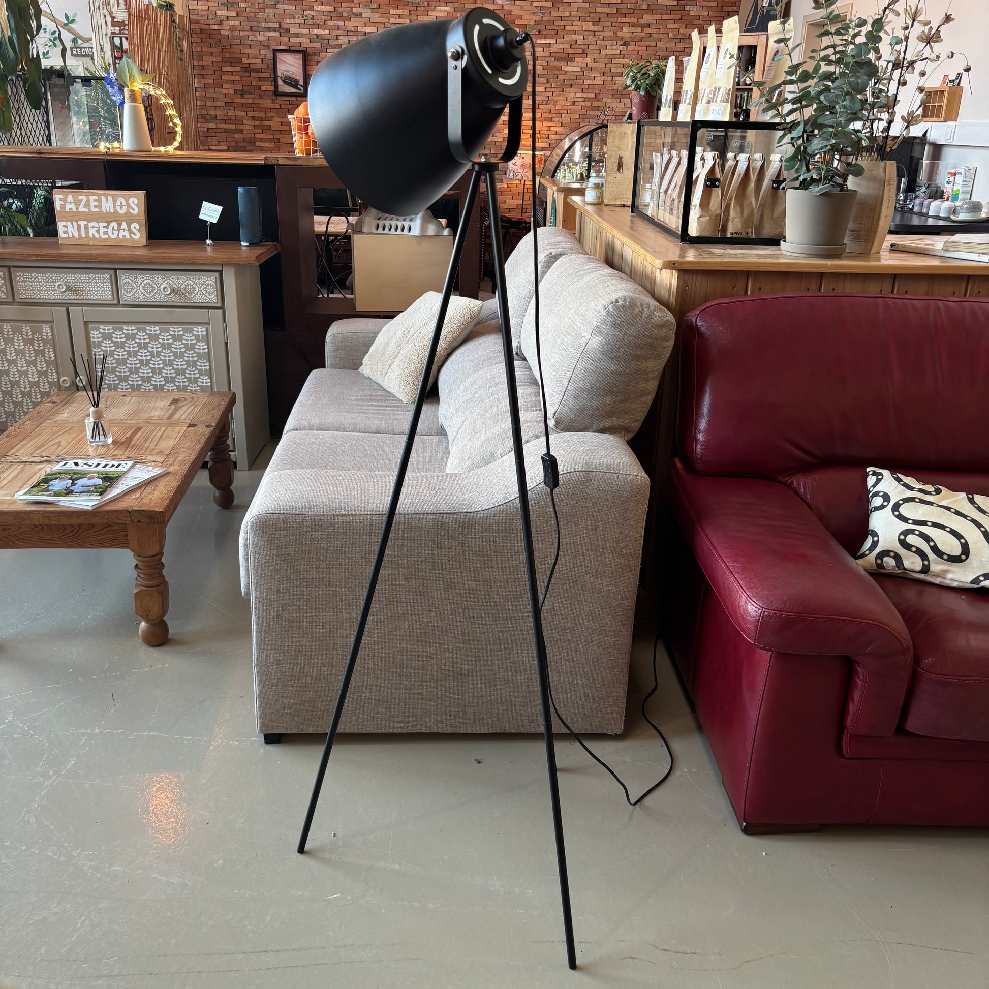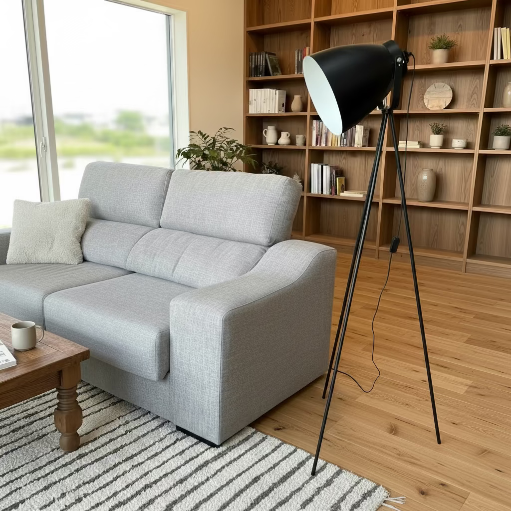 Modern floor lamp with white shade and tripod base. Clean, contemporary design that works well in living rooms or offices.