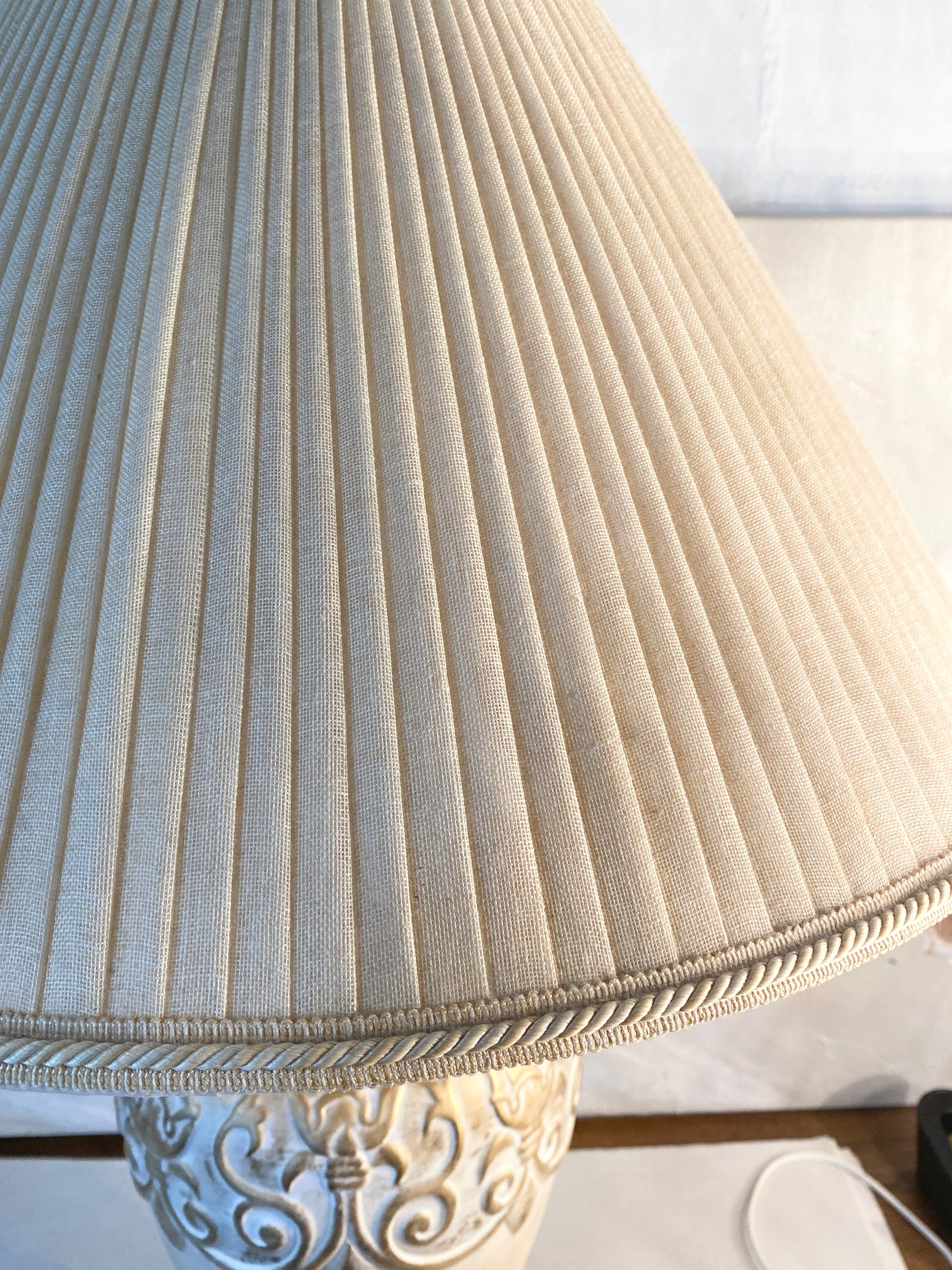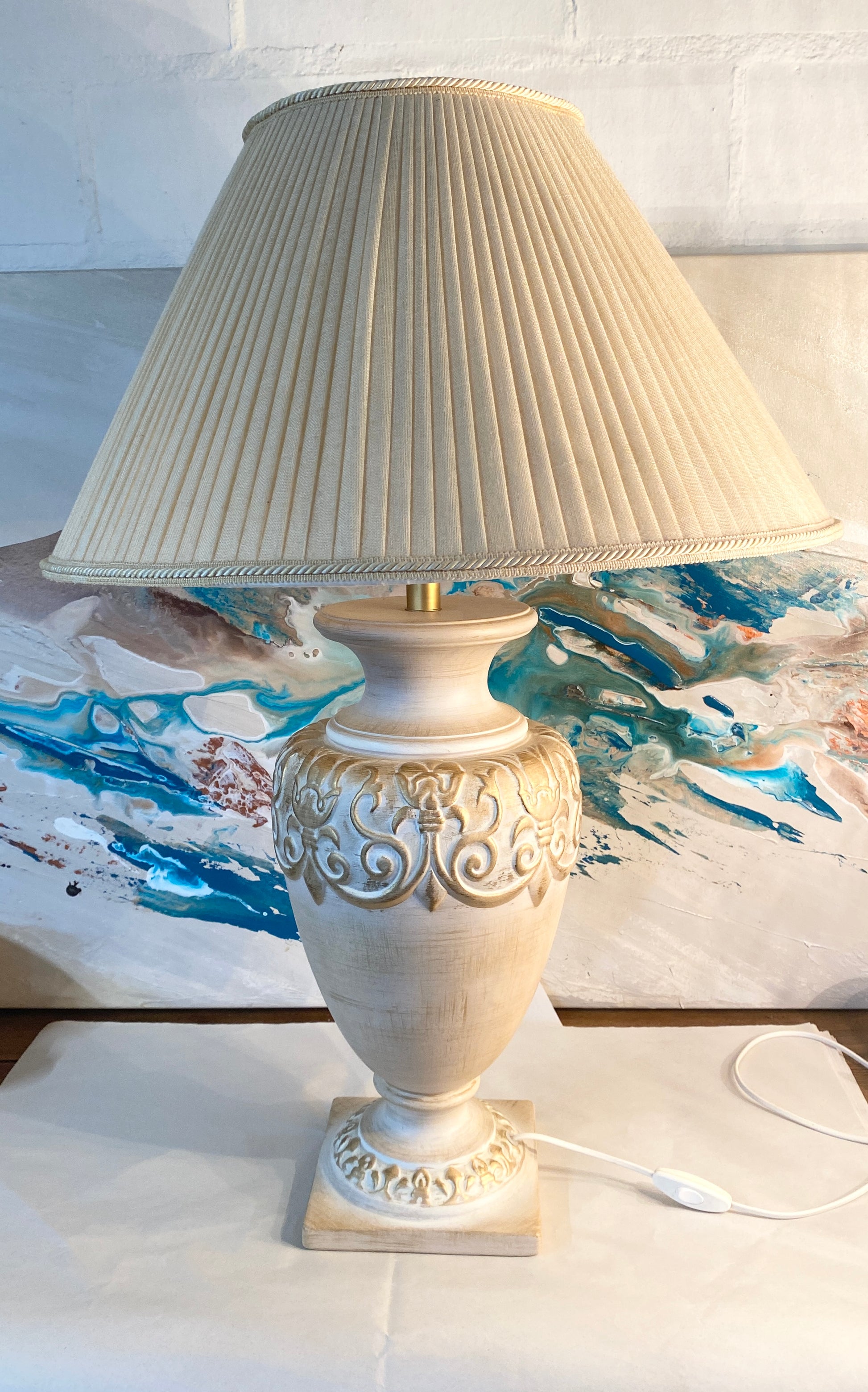 A large classical looking table lamp with a cream ceramic base with gold detailing.