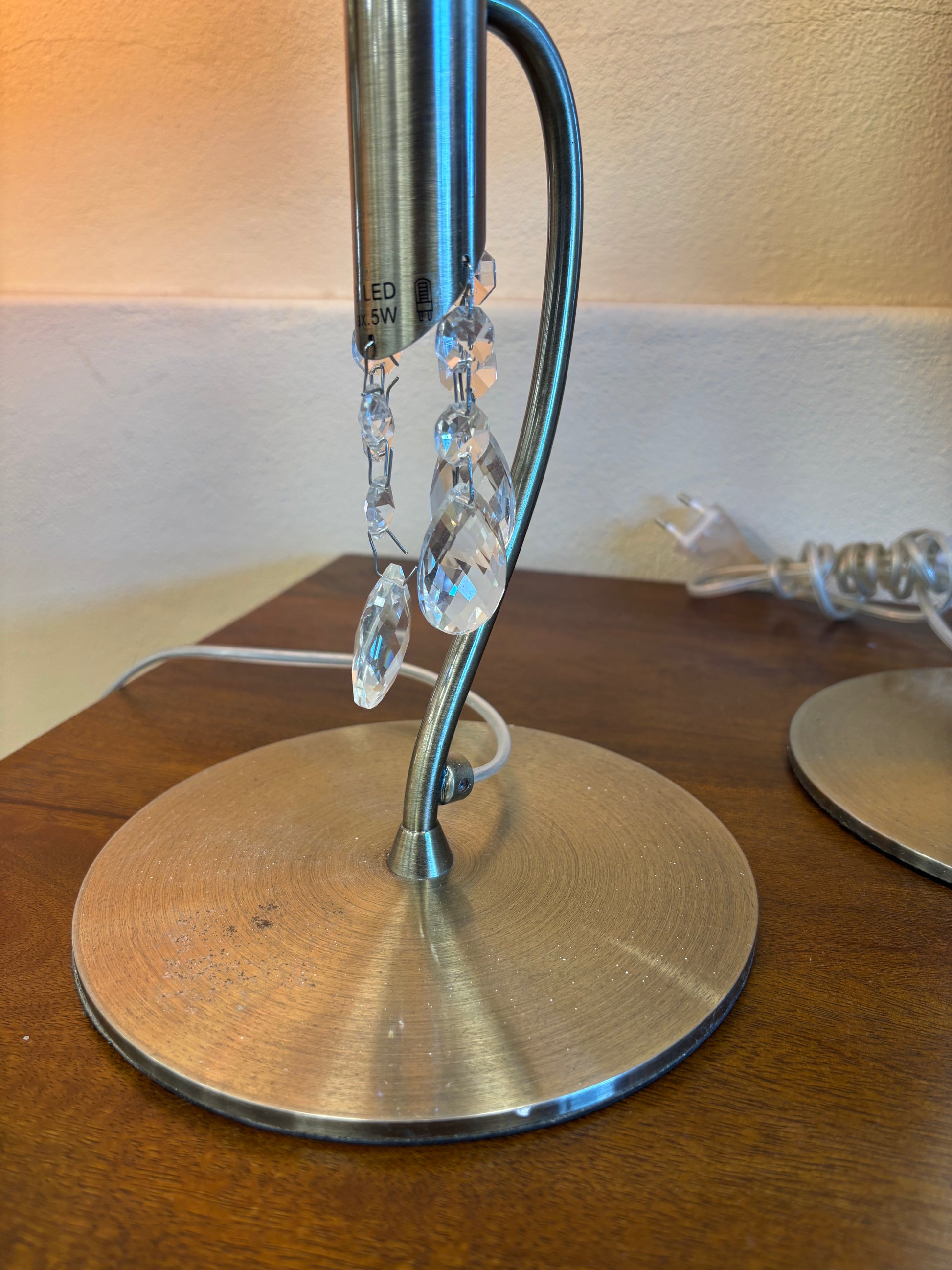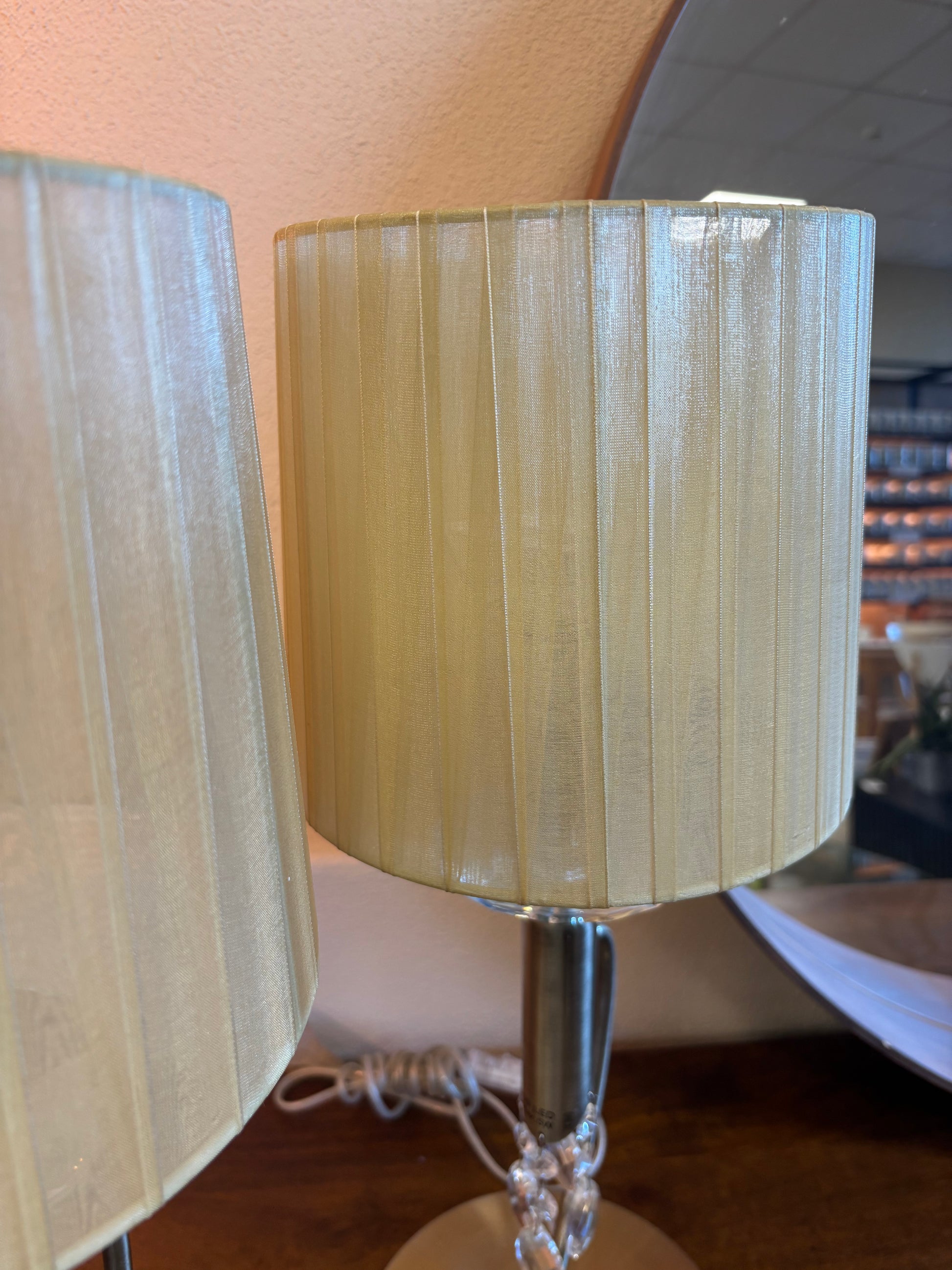 Elegant pair of table lamps with sleek chrome bases and soft neutral shades. Perfect for bedside tables or a living room to create a warm, inviting glow.