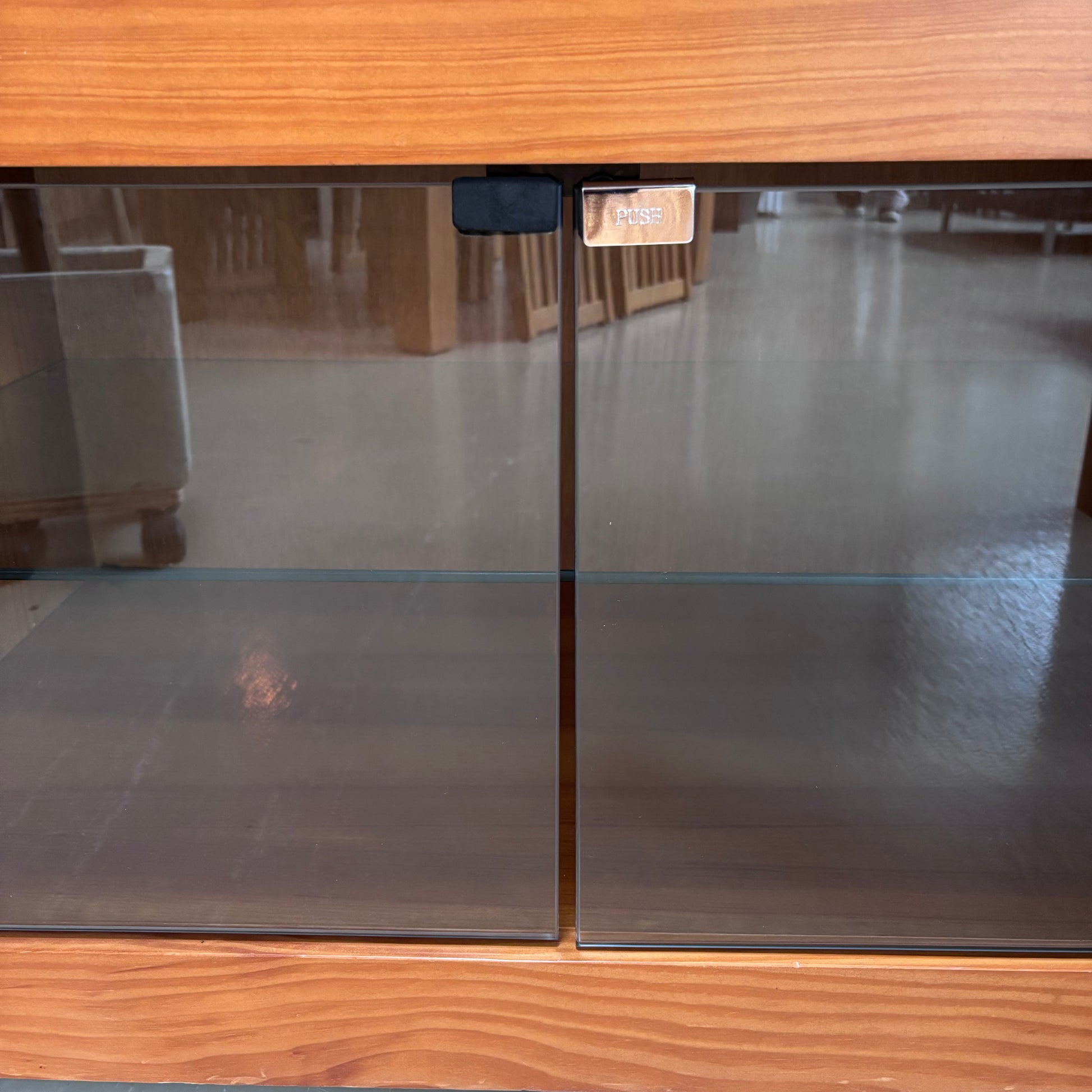 Contemporary wooden media unit with frosted-glass doors, offering a stylish way to store electronics, books, or décor in a living room setup.