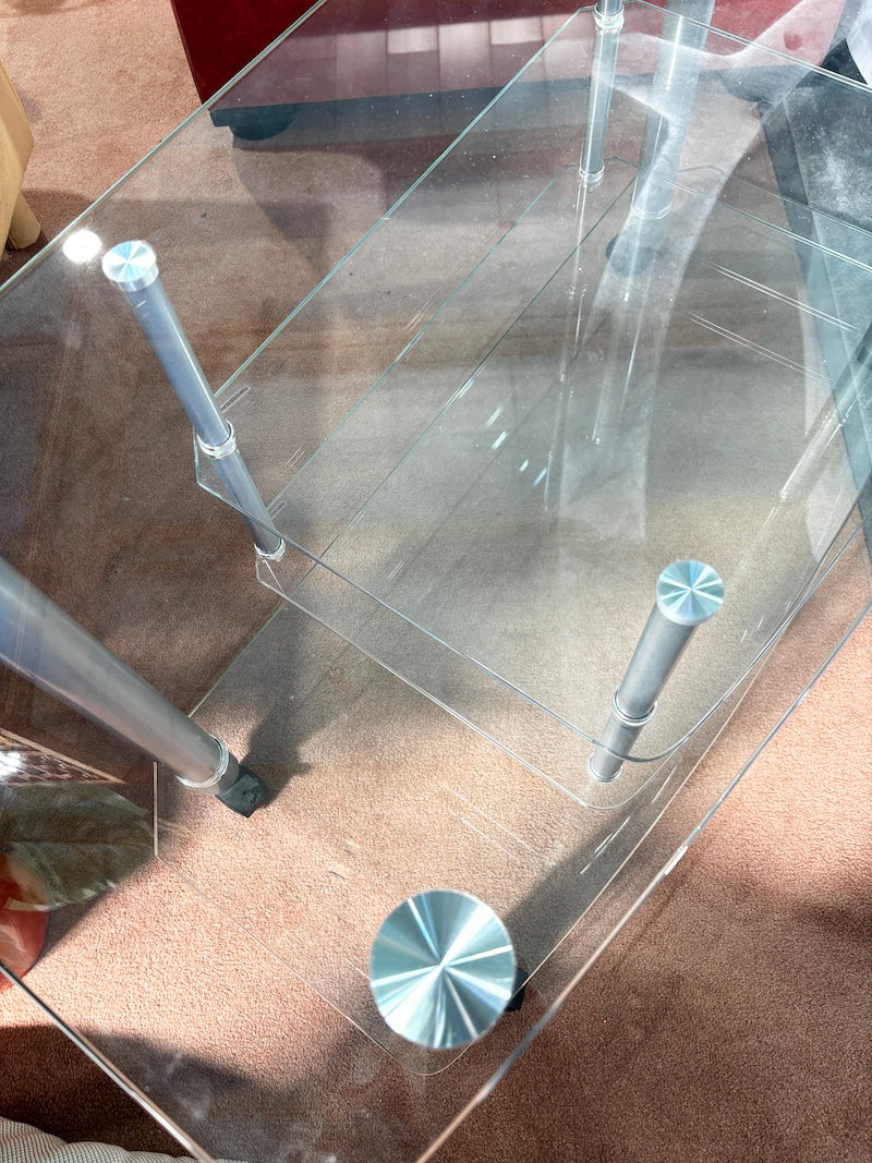 Sleek glass and chrome media unit on wheels, featuring two suspended glass shelves.