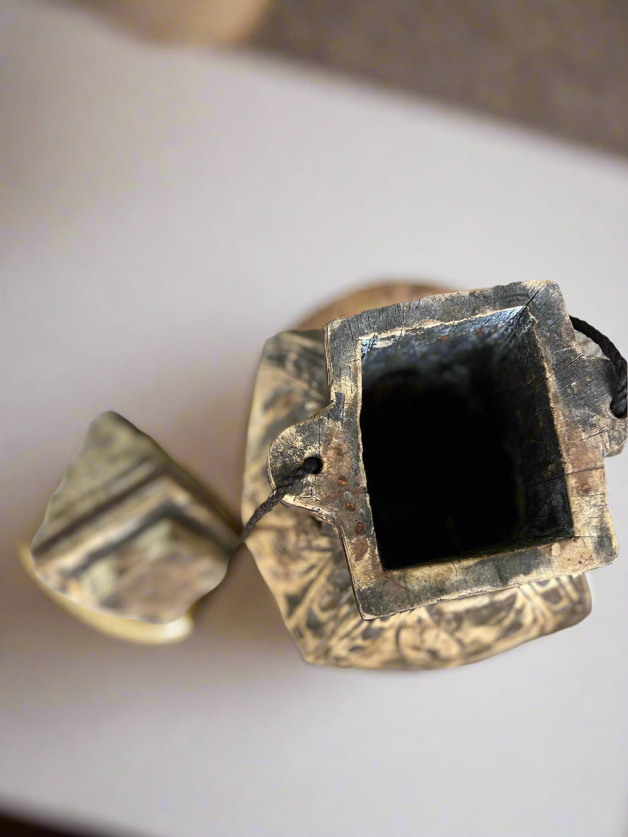 This beautifully handcrafted oil dispenser combines functionality with artistic charm. Made from carved wood, it features intricate floral and geometric patterns that give it a rustic, traditional appeal. The pyramid-style top and natural finish evoke old-world craftsmanship, while the sturdy rope handle adds both utility and character.