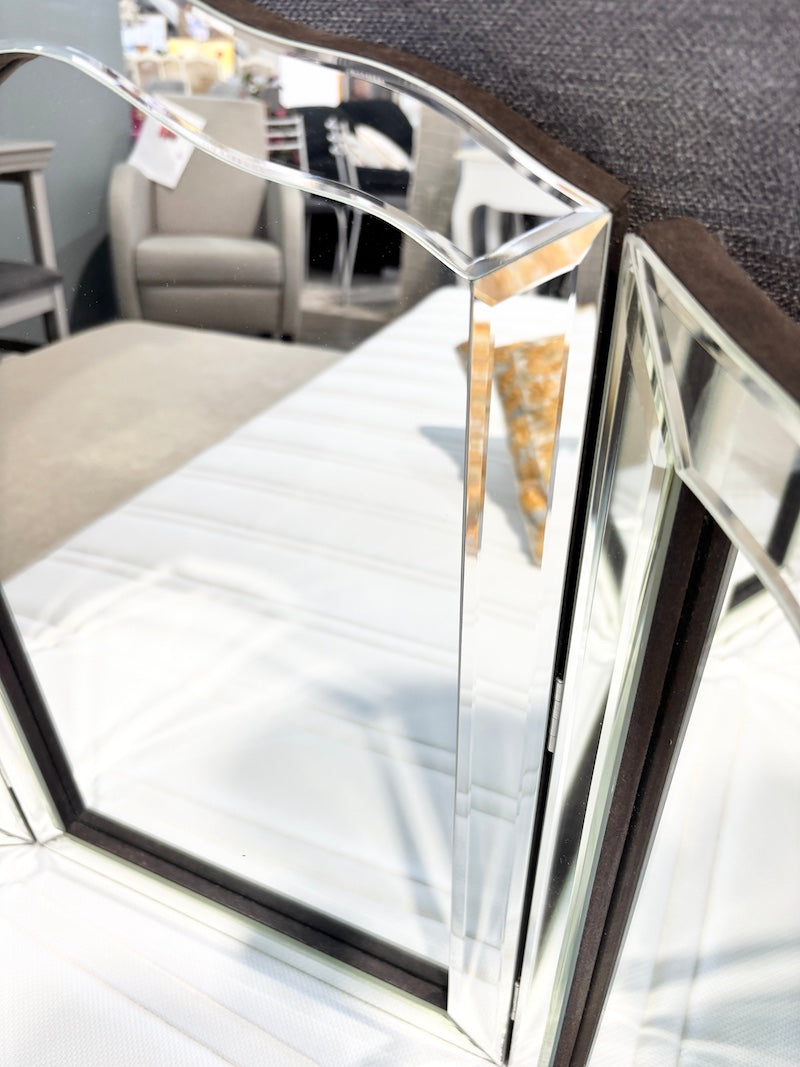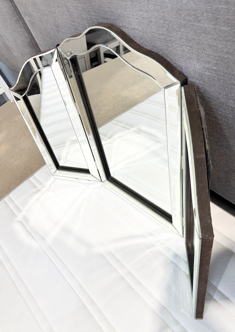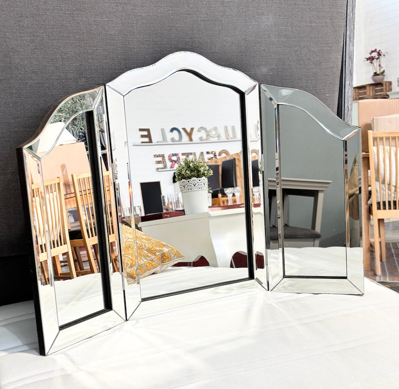 A French-style, trifold tabletop vanity mirror featuring a beveled glass design. Perfect for sitting upon your dressing table.