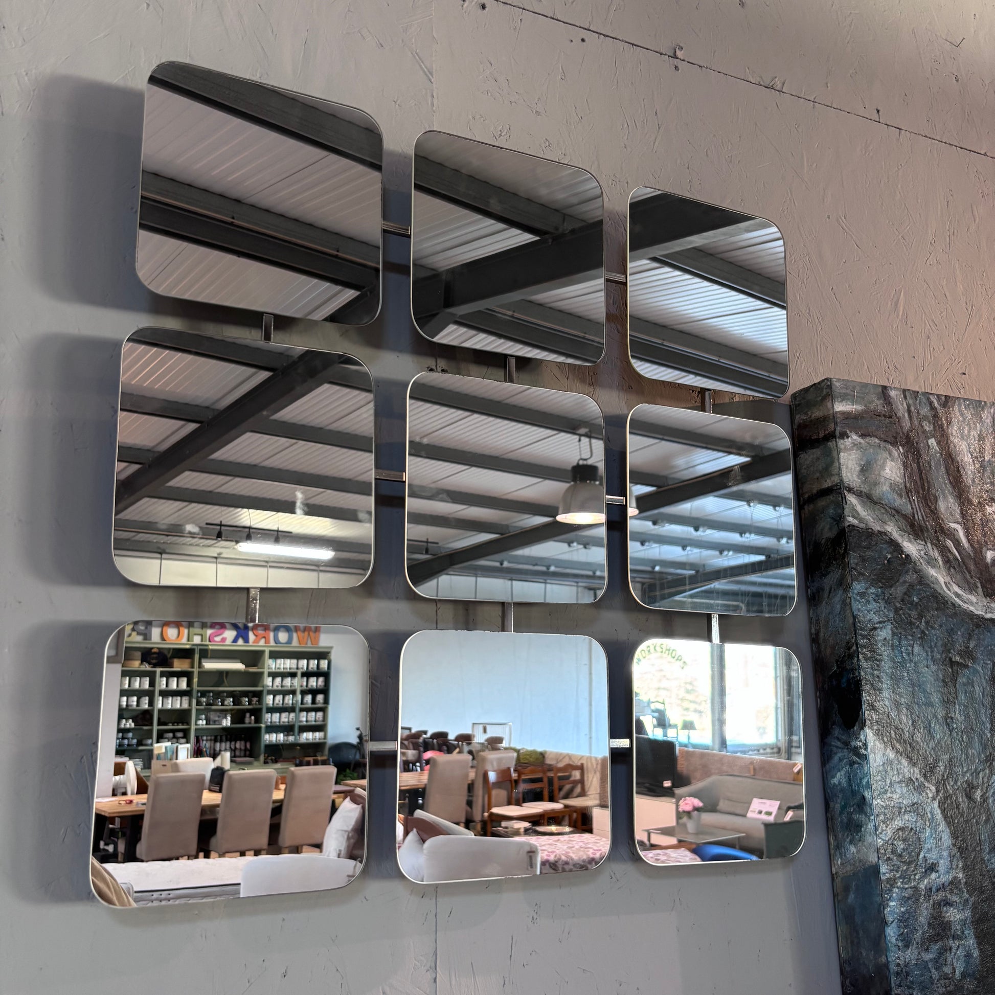 Contemporary wall mirror set with multiple square reflective panels, creating a stylish geometric feature for living or dining spaces.
