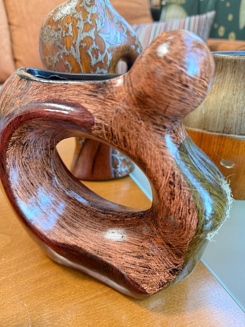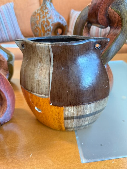 Set of 5 ornaments which display well as a collection. Some can be used as vases or just stand alone. They have a handcrafted feel to them.