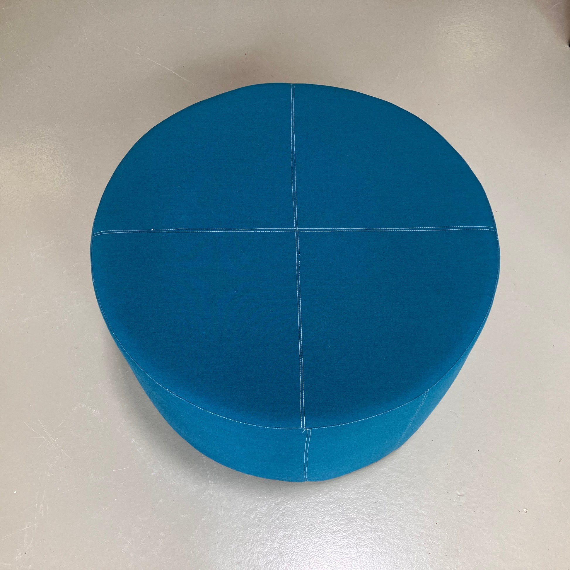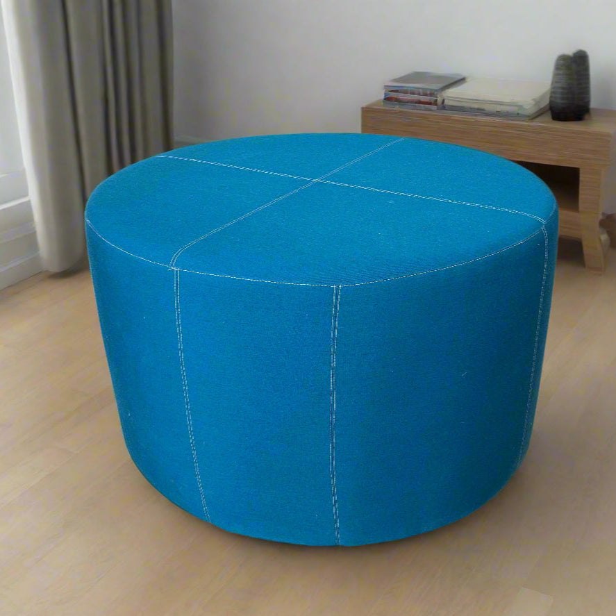 Large round ottoman upholstered in a vibrant turquoise blue fabric with subtle stitched paneling. Can be used as a footstool, spare seat, or coffee table with a tray.