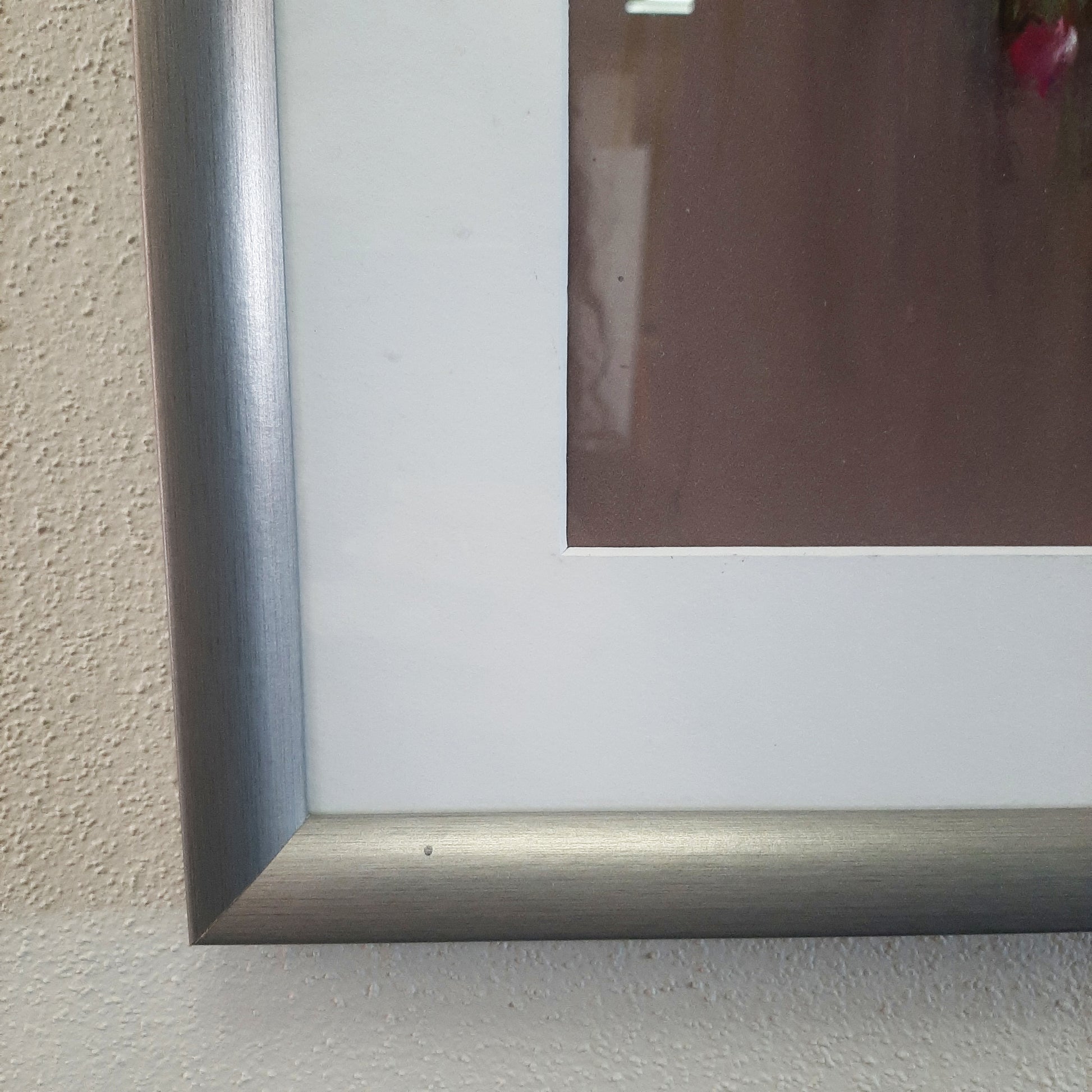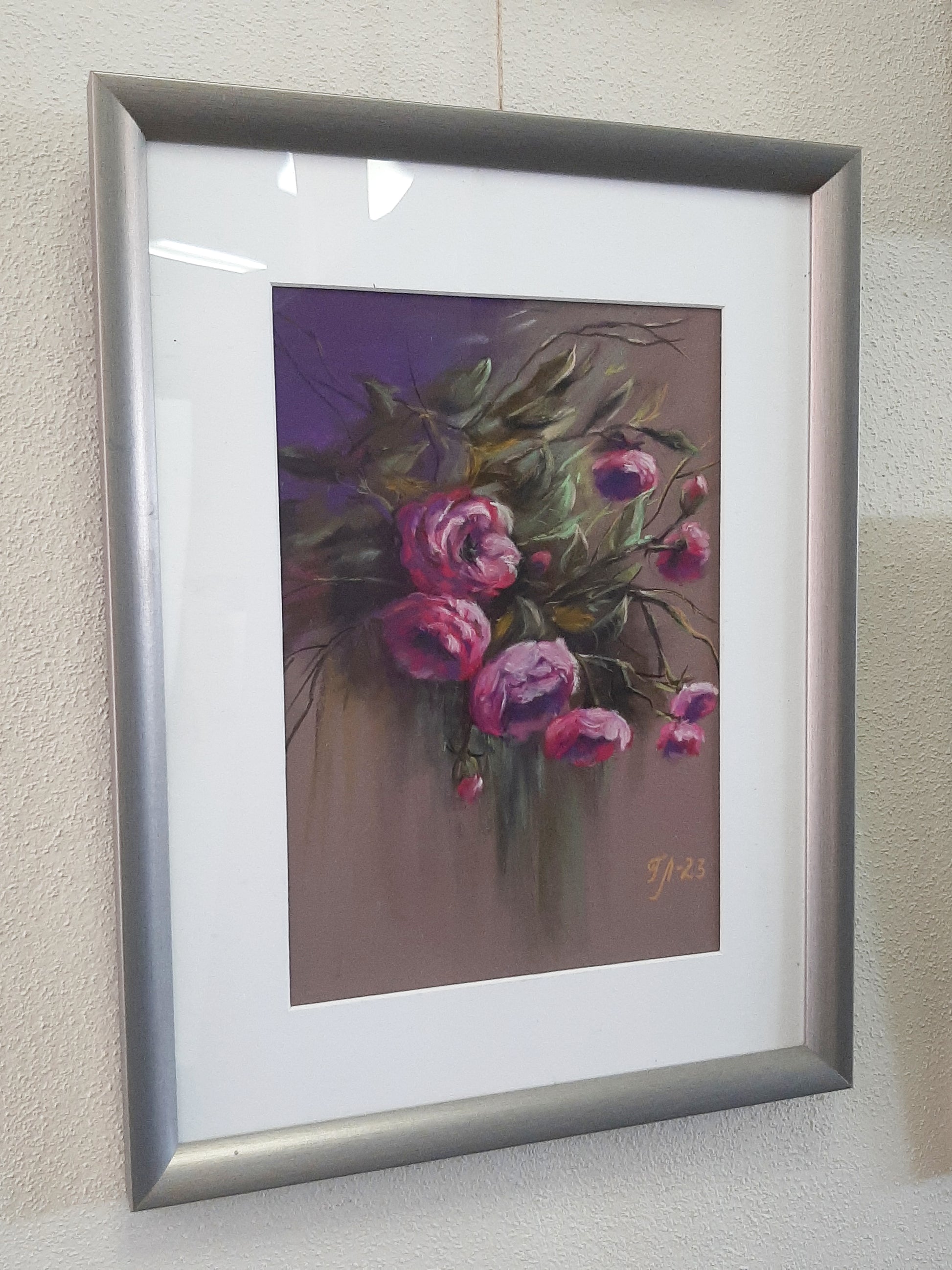 This painted artwork inspired by Henri Fantin-Latour's 'peonies' features a moody bouquet of peonies with a dark background, highlighted with a silver frame. This artwork is perfect for adding depth to any room.