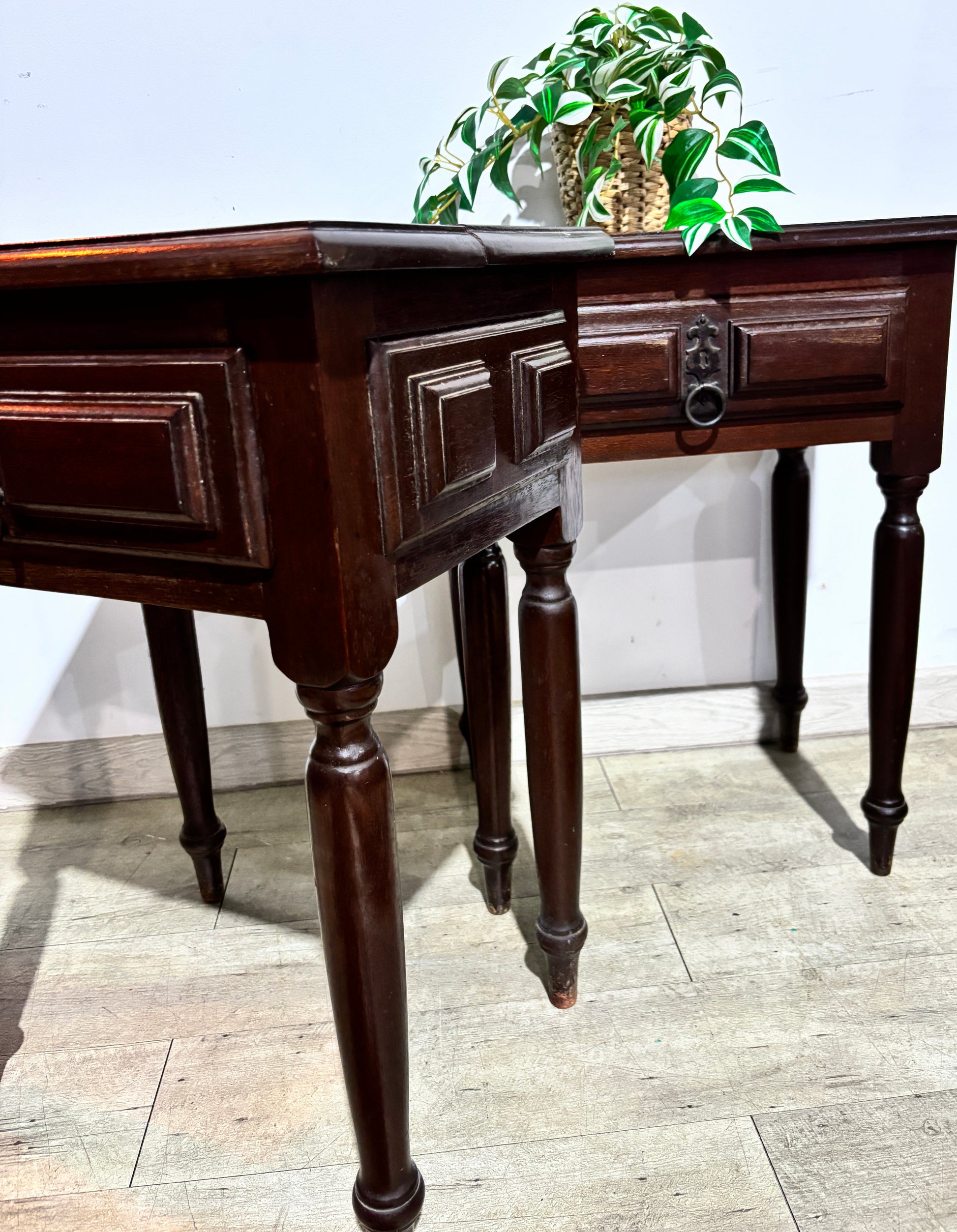 A solid and traditional pair of dark wood bedside tables, each with a single drawer. One table top has a crack along its length which is a minor detail with this type of furniture, which is made to last.