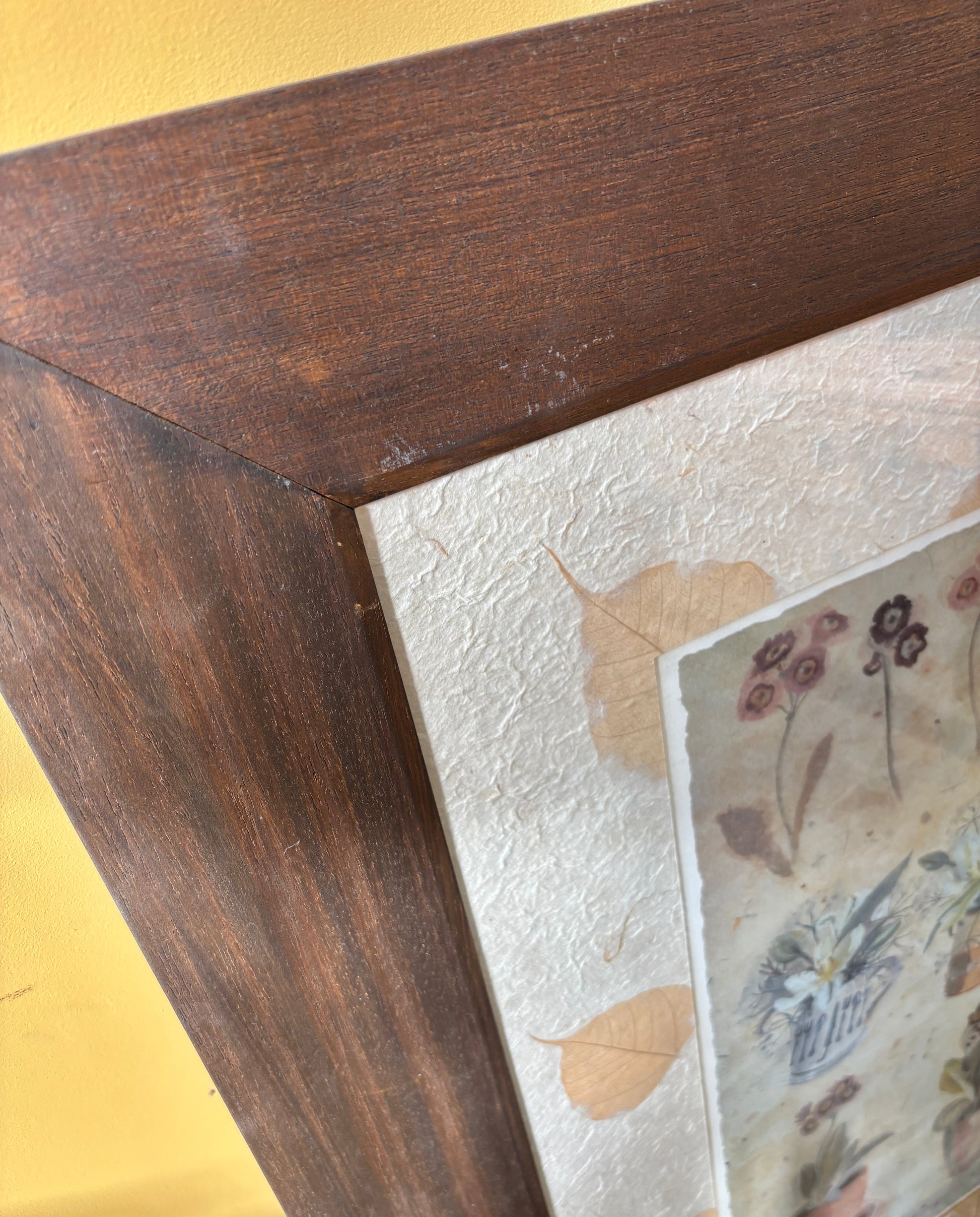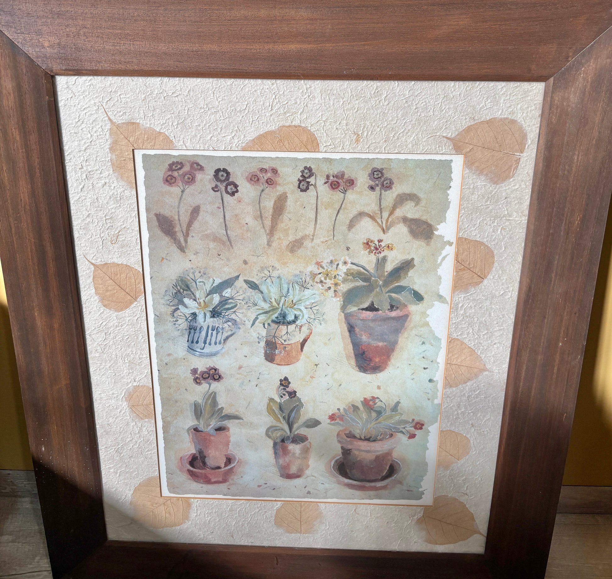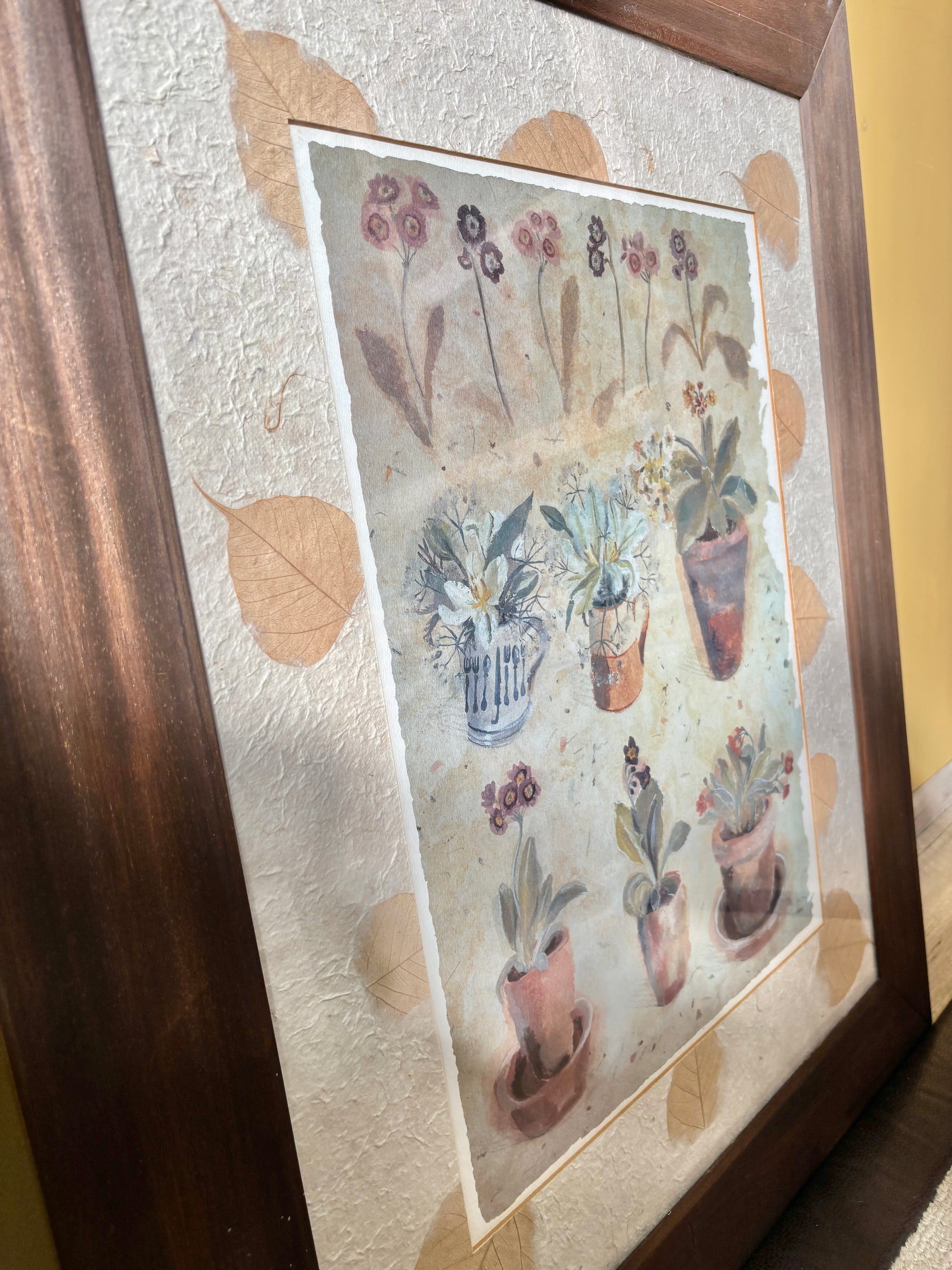 A pretty picture of potted plants which is unusually framed in natural paper scattered with leaves and in turn with wide dark wood.