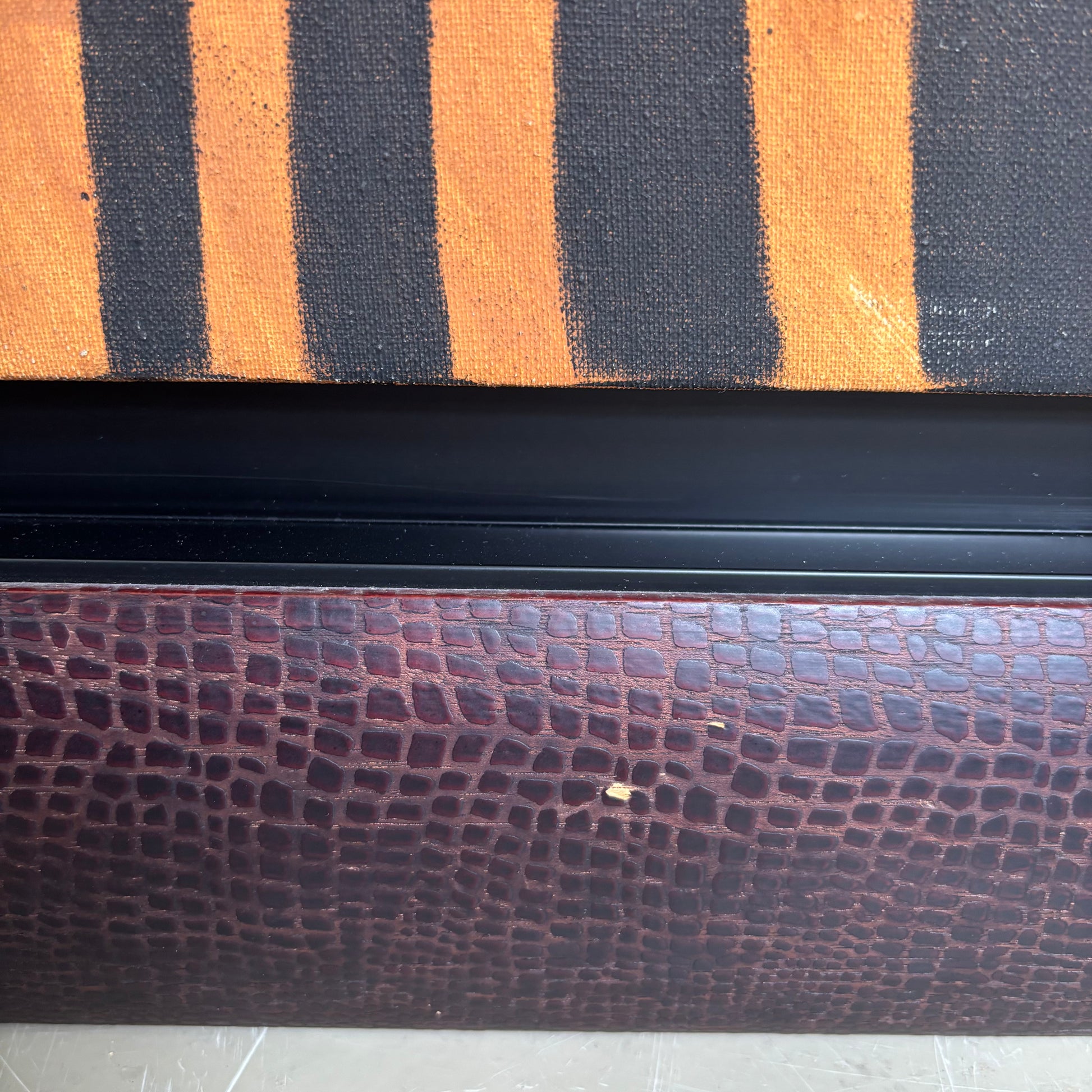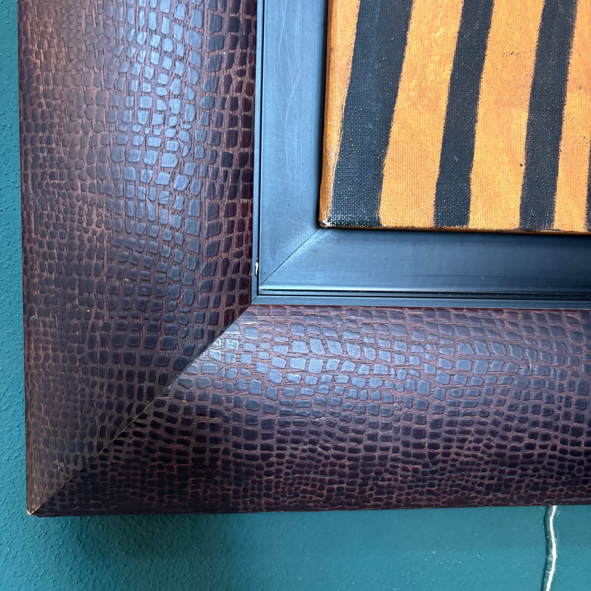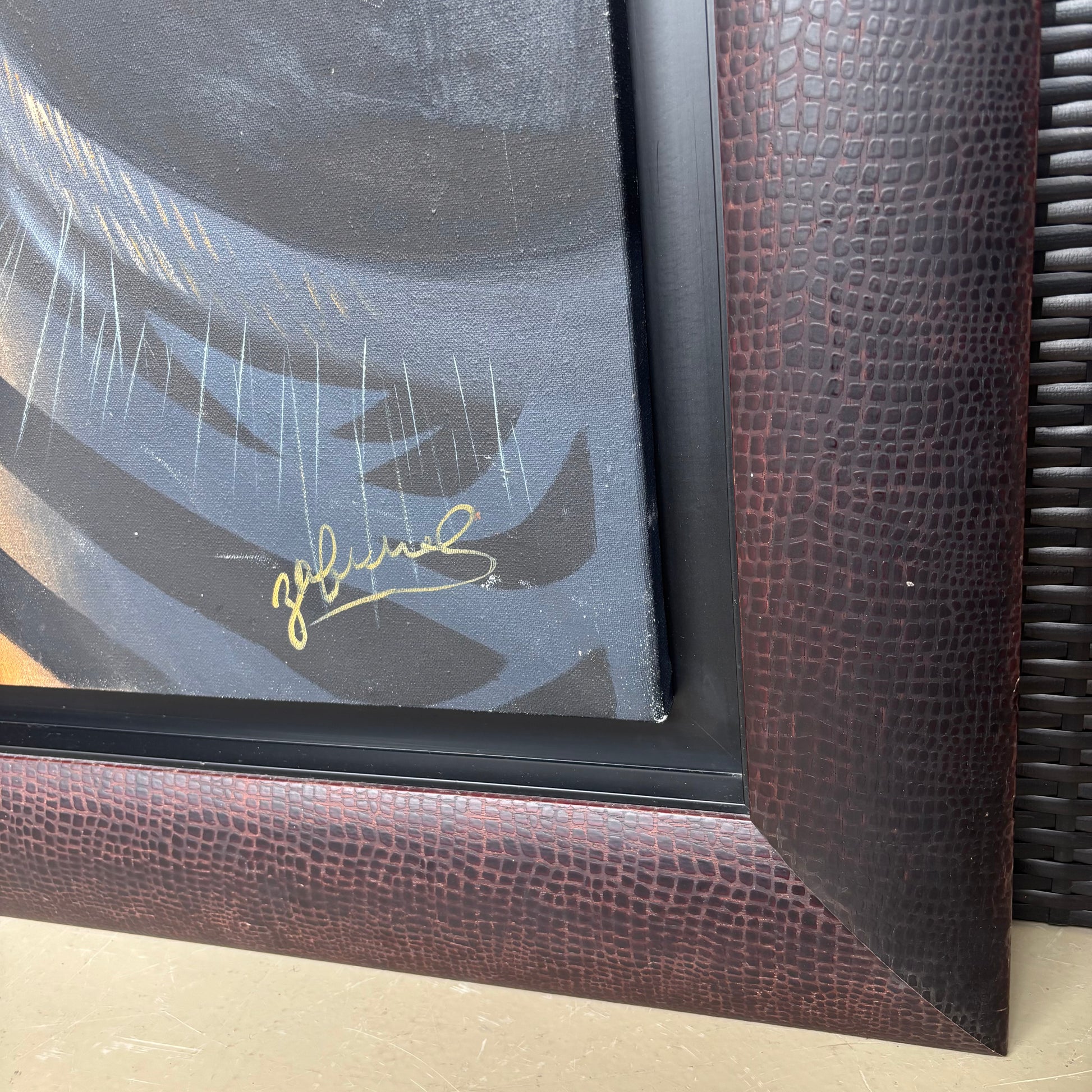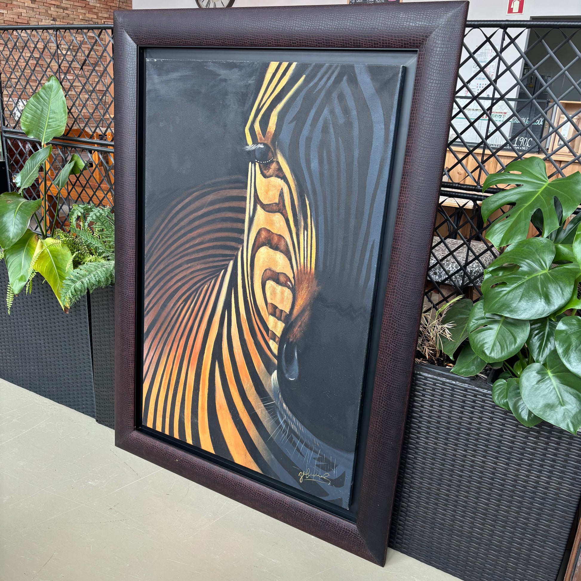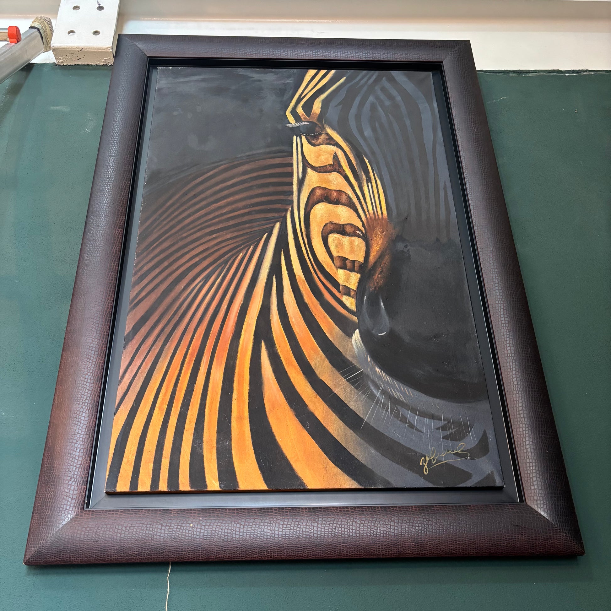 Striking framed zebra artwork with bold and gold tones. A unique statement piece that adds a modern, artistic touch to any room.