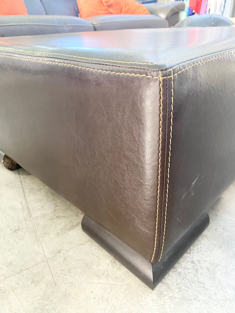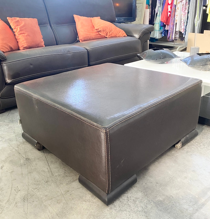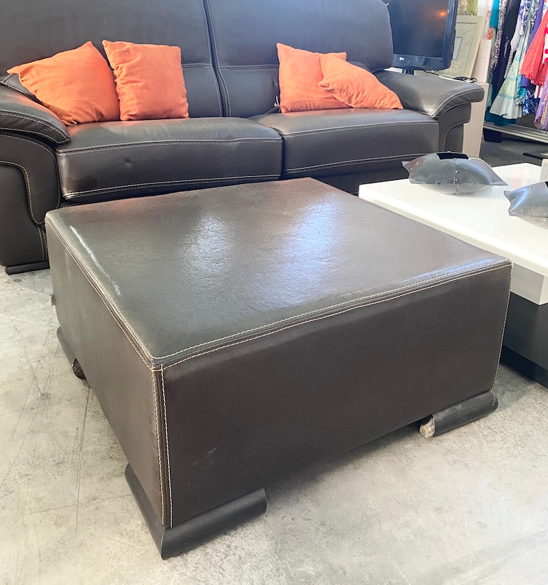 A firm large square footstool, upholstered in chocolate faux leather, standing on wooden feet.