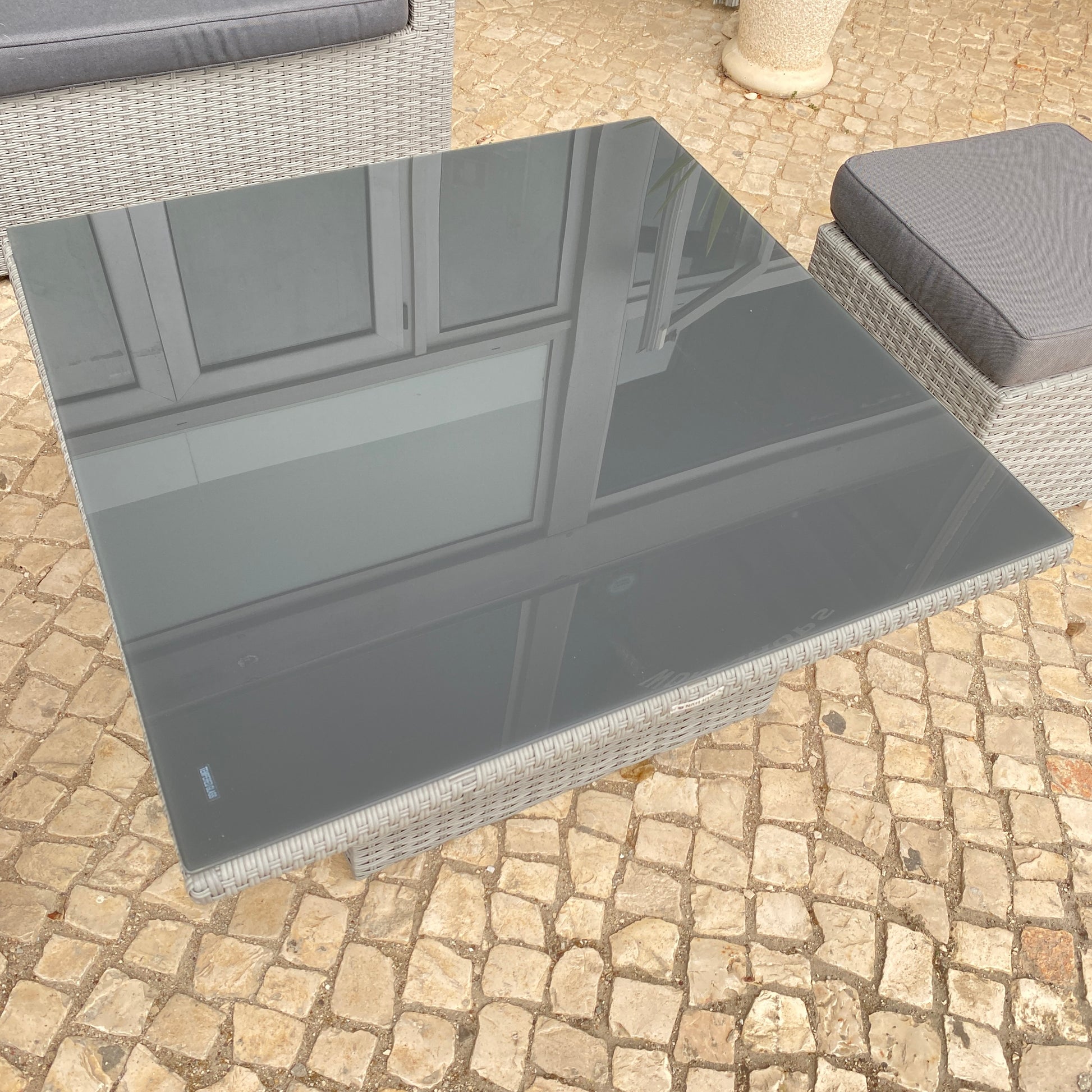 Stylish grey rattan corner sofa with matching glass-top coffee table and stool. Weather-resistant and perfect for outdoor lounging or patios.