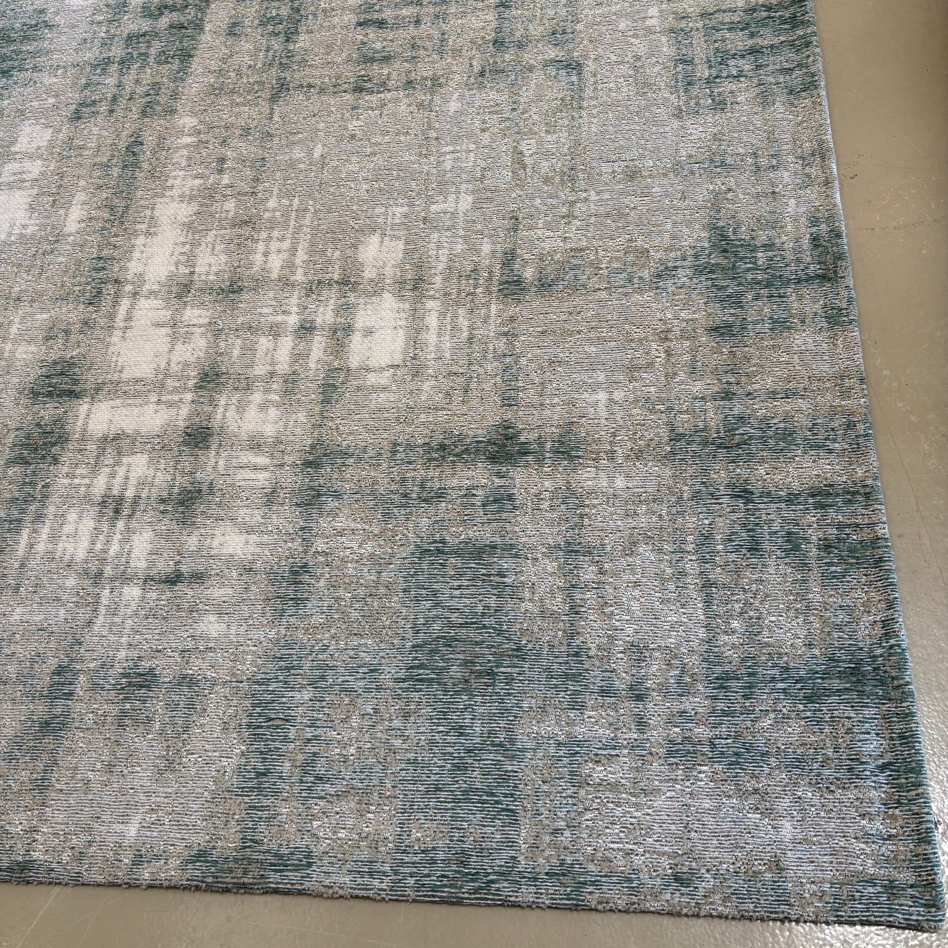 Soft, muted aqua rug with subtle texture. A calming foundation piece that complements both modern and classic interiors.