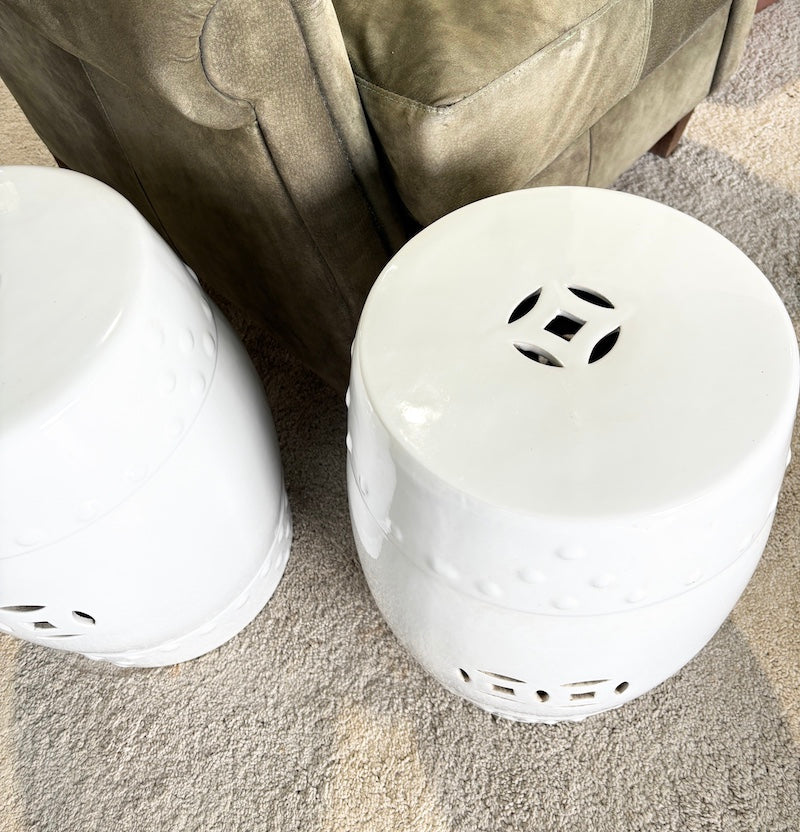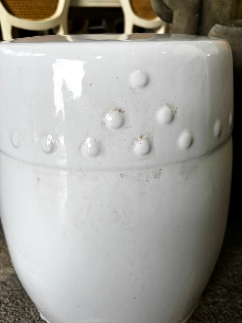 This white ceramic piece looks like a giant salt cellar, but can be used as oriental decoration, an elegant side table or as a stool. Please note that we have two available for sale.