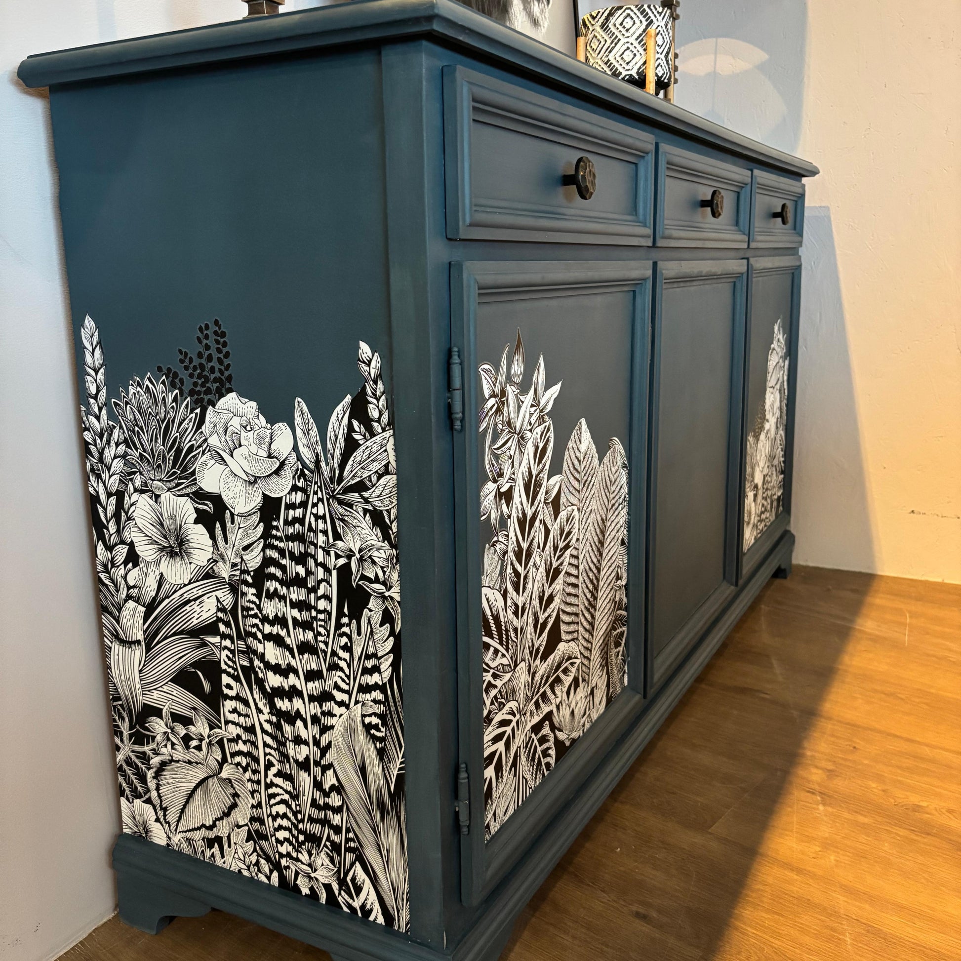 This sideboard was up-cycled with Annie Sloan Aubusson Blue and a Redesign Abstract Jungle Transfer sealed with clear wax. It offers generous storage with three drawers and door cabinets beneath. Ideal for storing dinnerware, linens, or household essentials while adding timeless style to your space.