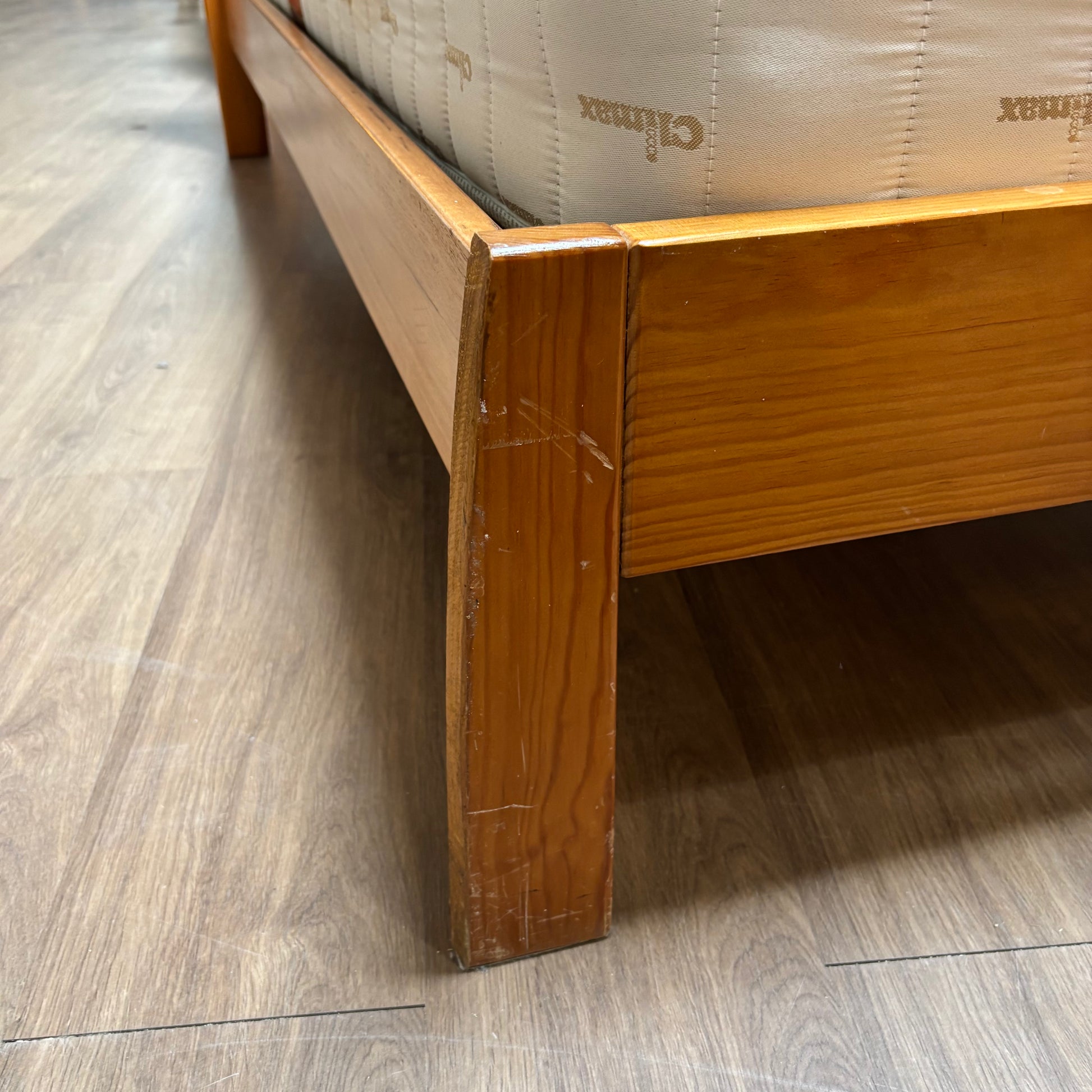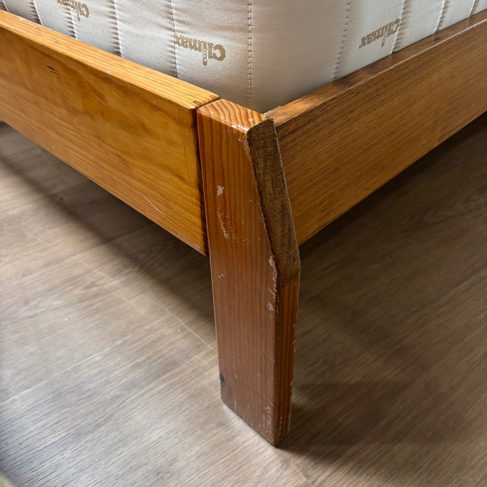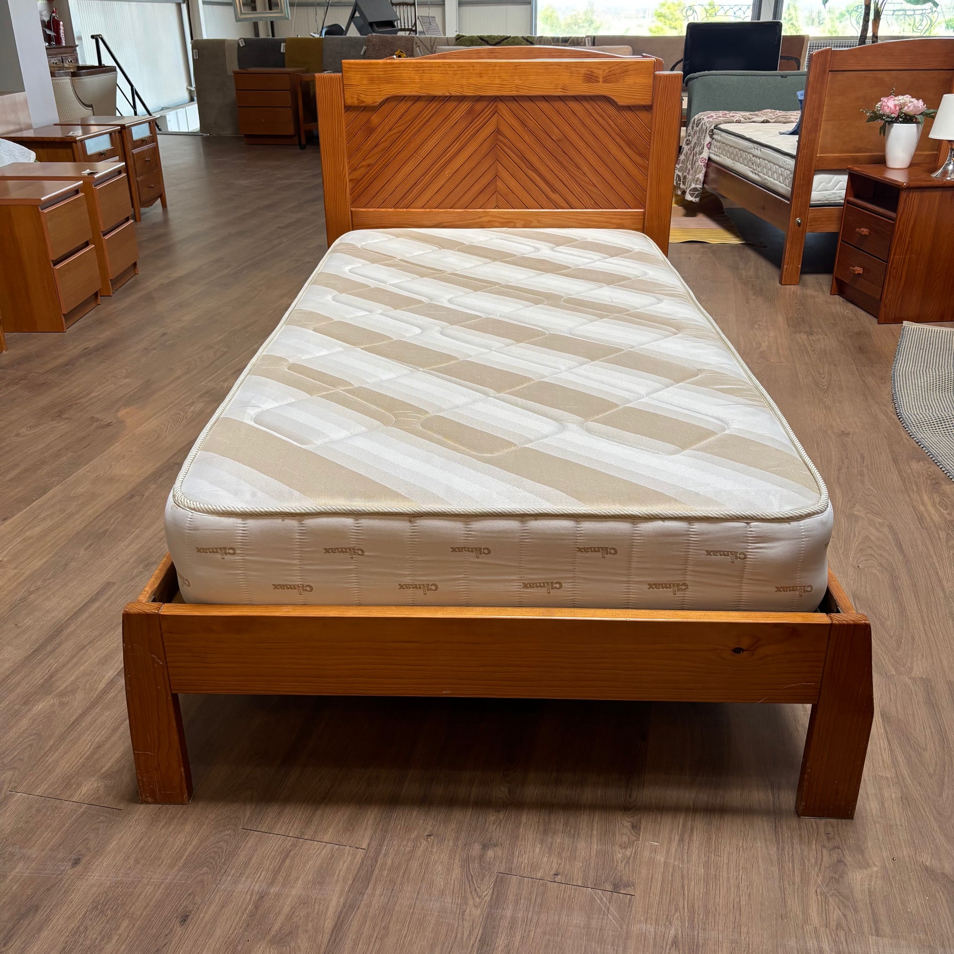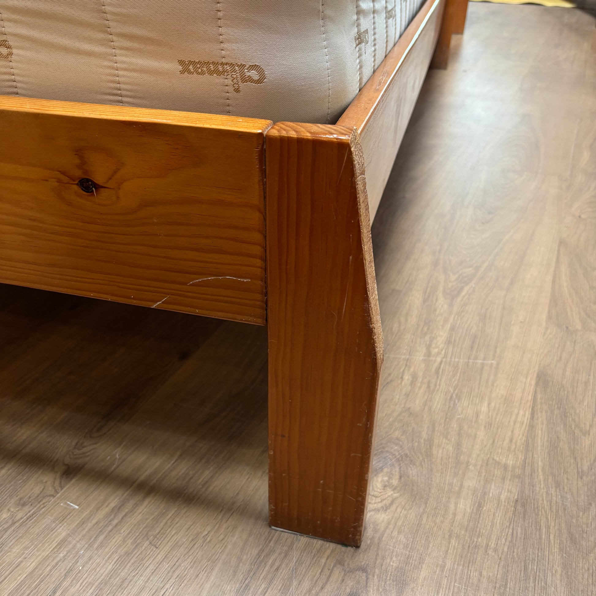 Compact pair of wooden single beds with mattress included. Great for guest rooms, kids’ rooms, or small spaces.